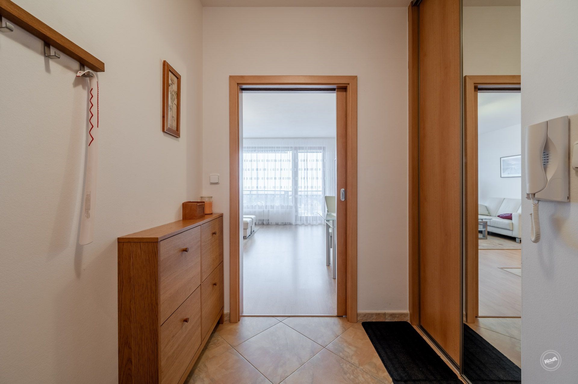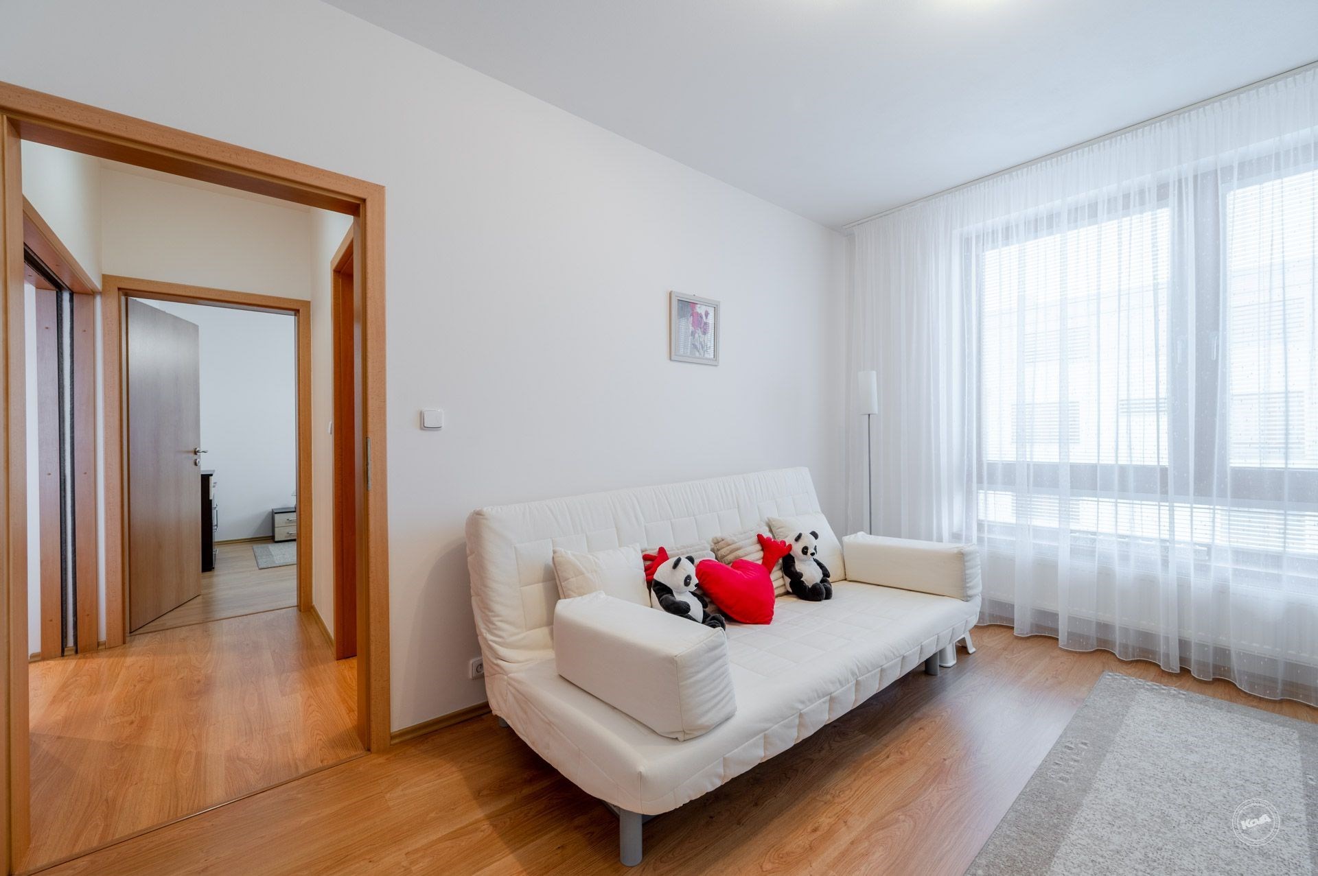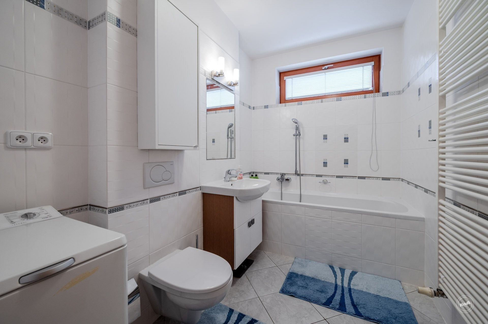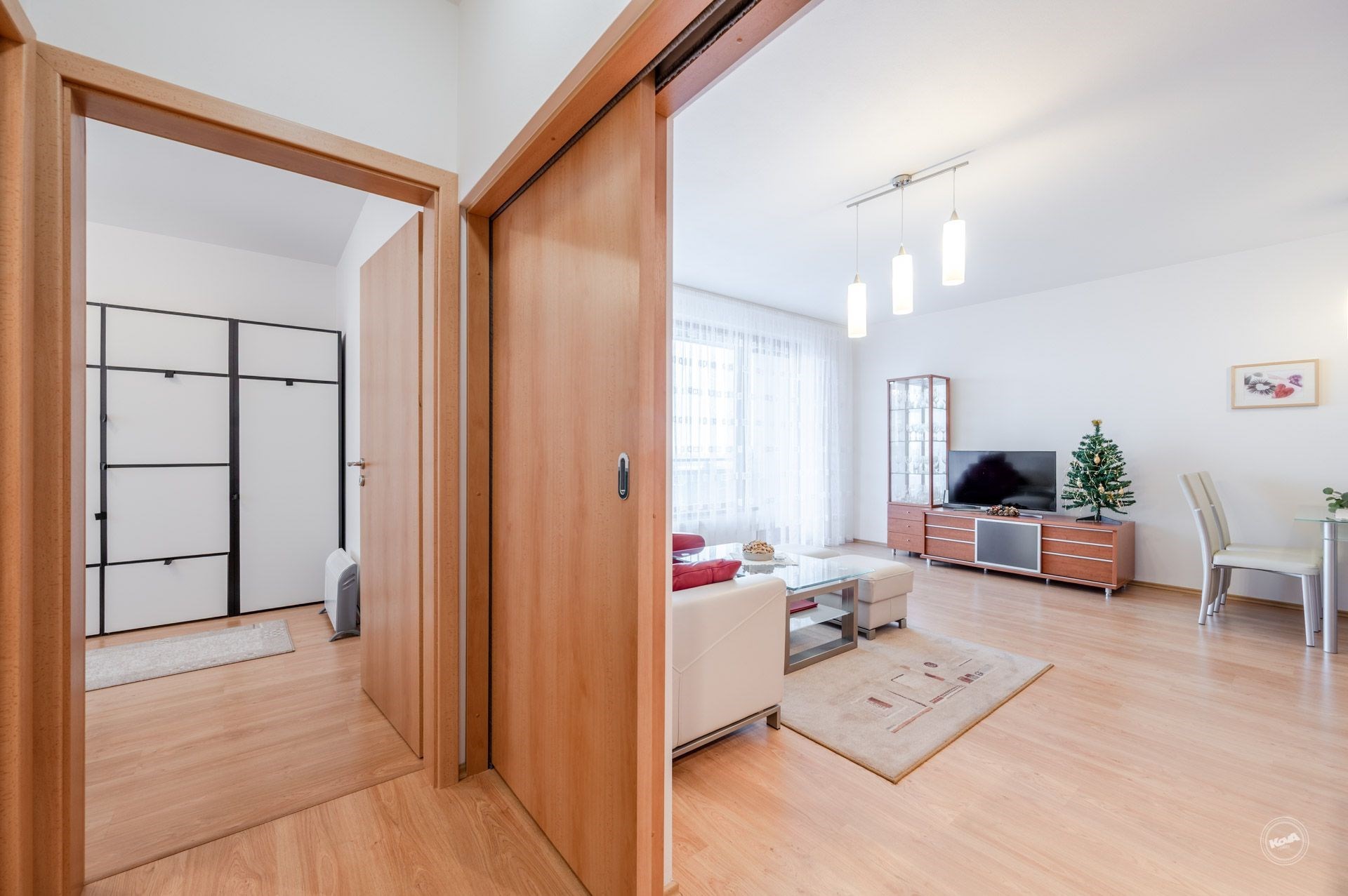 Dominantou bytu je obývací prostor s kuchyňským koutem a přímým vstupem na lodžii, odkud se otevírá krásný, ničím nerušený výhled. Právě zde si člověk nejlépe uvědomí, že nebydlí „na sídlišti“, ale v klidné rezidenční enklávě.