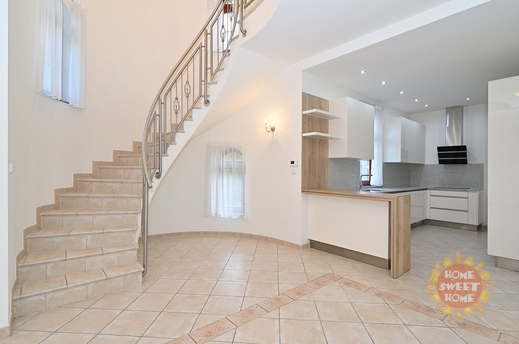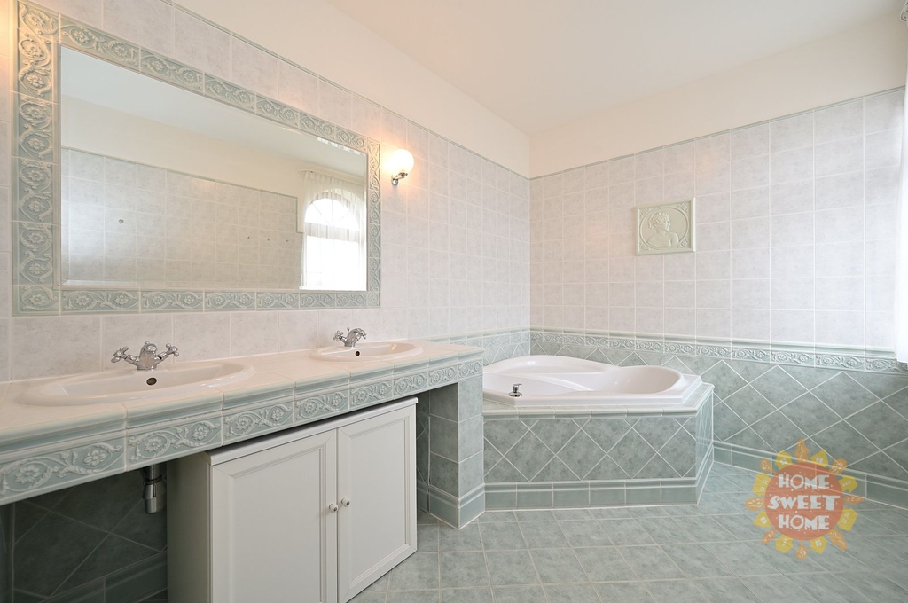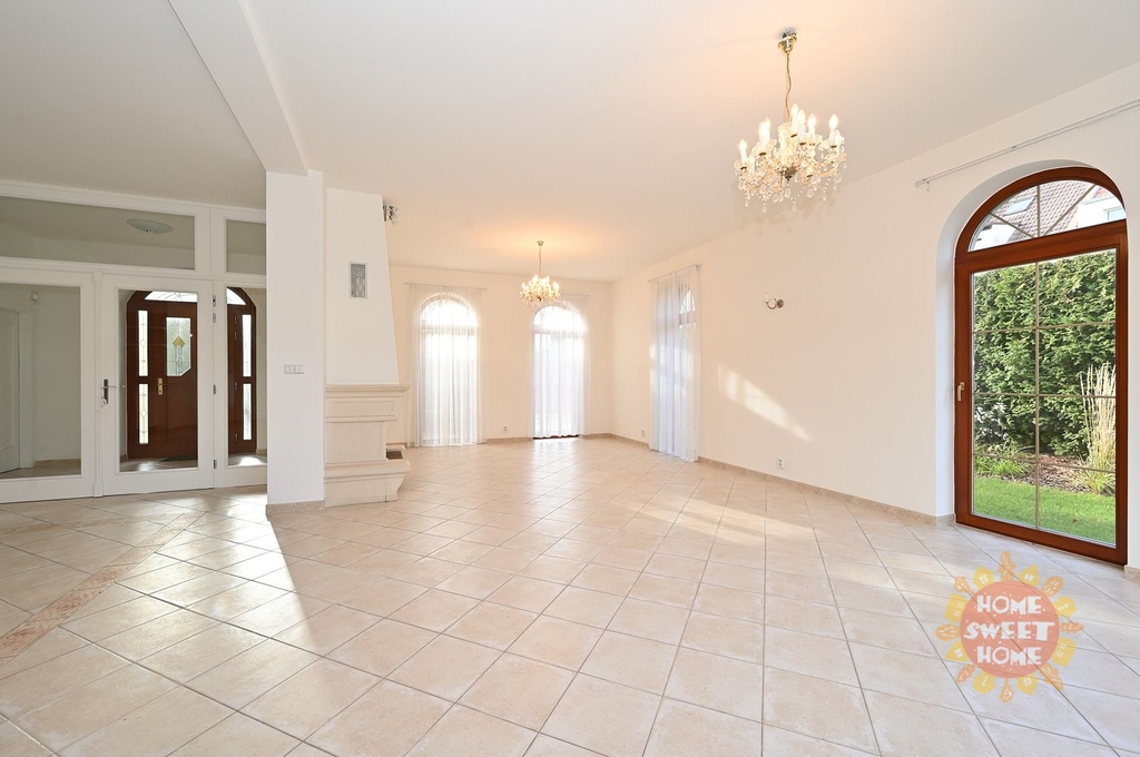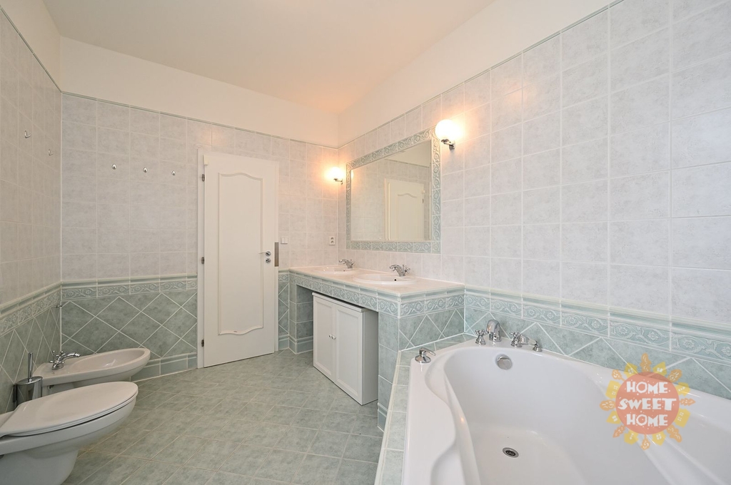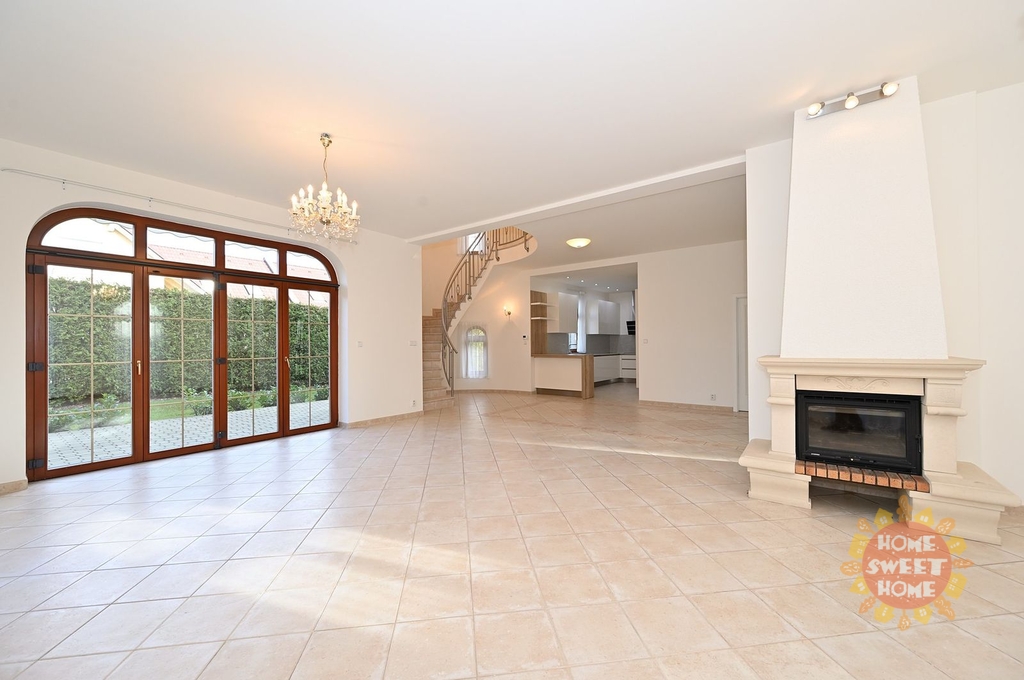 V přízemí domu je vstupní hala, prostorný obývací pokoj s krbem a kompletně vybaveným kuchyňským koutem, toaleta, šatna a prostorná garáž. V prvním patře se nachází čtyři ložnice a tři koupelny. Z hlavní koupelny je vstup na terasu. Bazén má rozměry 5x3x1,5 má podvodní osvětlení, protiproud a pohodlné schody. Zakrytý je solární plachtou a má pískovou filtraci. Prostorná terasa přístupná z obývacího pokoje je vybavena elektricky ovládanou markýzou. Dům se pronajímá nezařízený. Cena za služby zahrnuje i odbornou péči o bazén a zahradu.