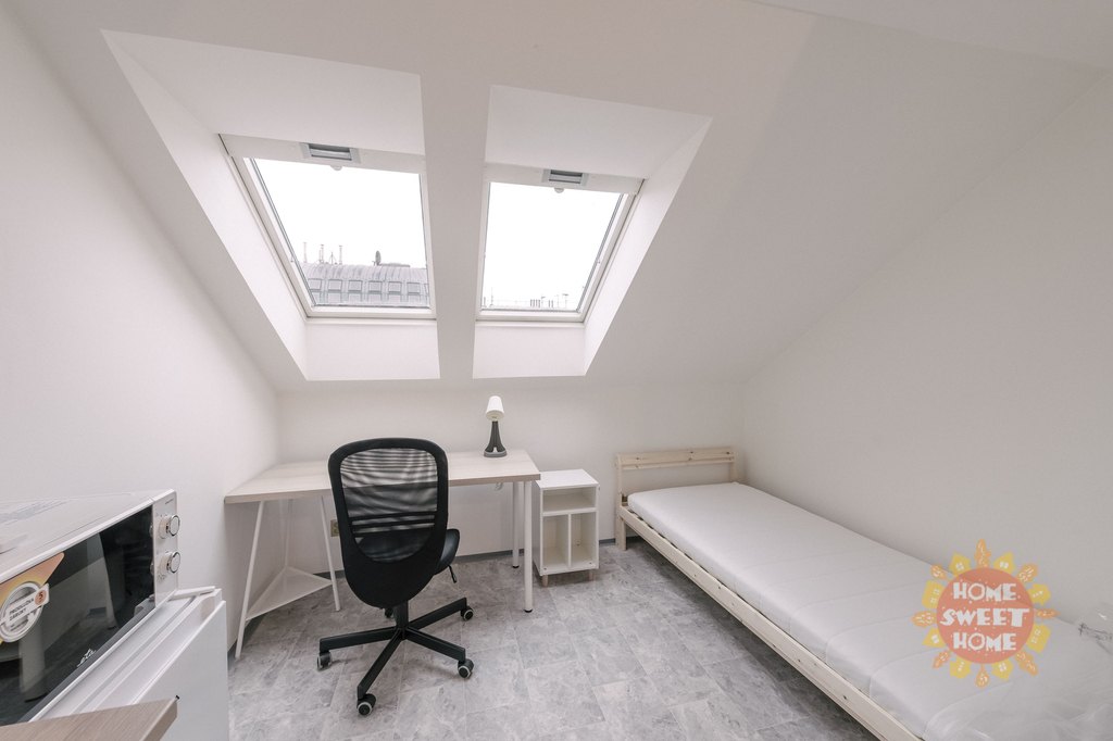 Nabízíme k pronájmu pokoj o rozloze 14 m² s vlastní kuchyňkou ve sdíleném apartmánu po kompletní rekonstrukci, který se nachází ve 4. patře cihlového domu v ulici Na Žertvách na Praze 8 - Palmovka. Tento pokoj je součástí devítipokojového bytu vybaveného vlastním menším kuchyňským koutem. Ve společných prostorech najdete kuchyni, místnost s pračkou a sušičkou, dvě koupelny se sprchovým koutem a tři oddělené toalety. Všechny pokoje jsou moderně vybaveny klimatizací, pracovním stolem, židlí, nočním stolkem, jednolůžkovou postelí včetně matrace a šatní skříní. V ceně poplatků je zahrnuto také vysokorychlostní internetové připojení a úklid společných prostor.
