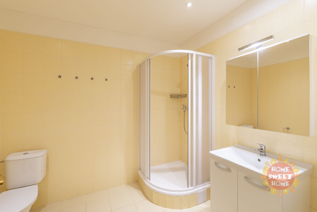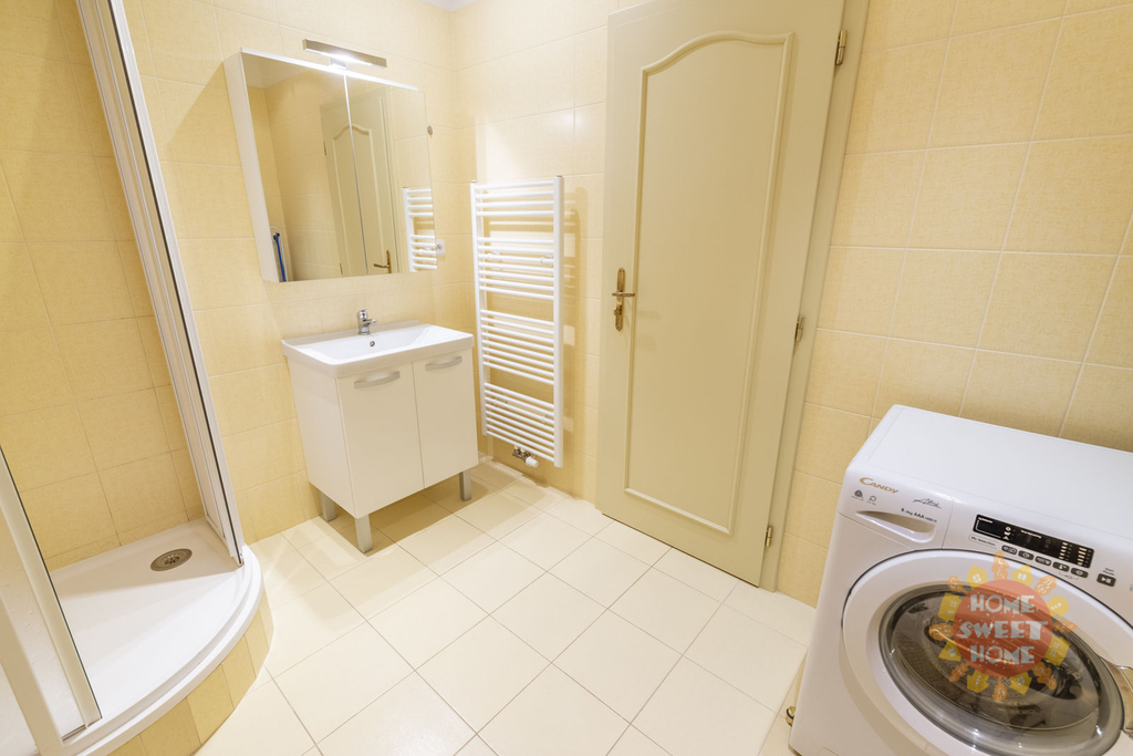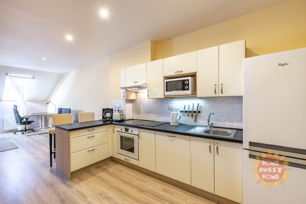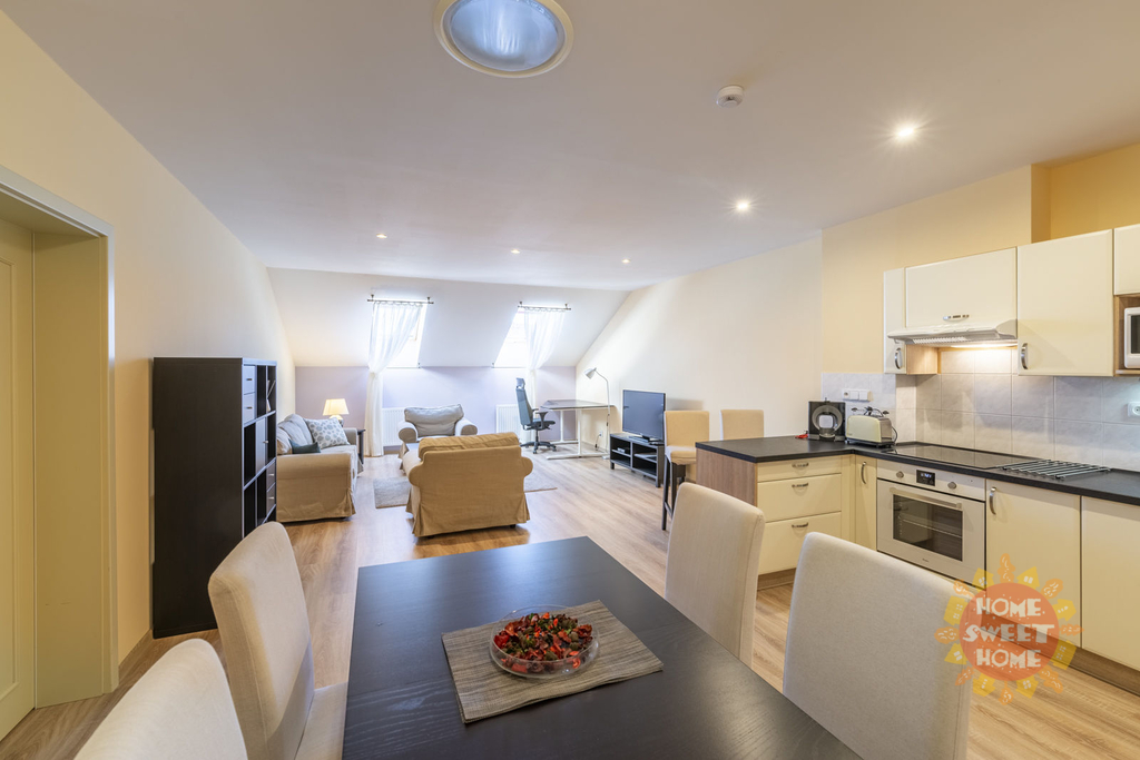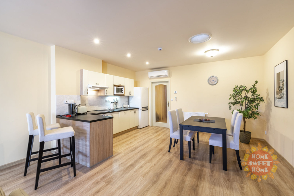 V bytě je vstupní hala, velký obývací pokoj s posezením a TV spojený s plně vybaveným kuchyňským koutem s jídelní částí (digestoř, sklokeramická varná deska, elektrická trouba, mikrovlnná trouba, myčka, lednice, kávovar, toustovač, sada nádobí), 2 samostatné ložnice s dvojlůžky, koupelna se sprchovým koutem, pračkou, sušičkou, toaletou a druhá samostatná toaleta.