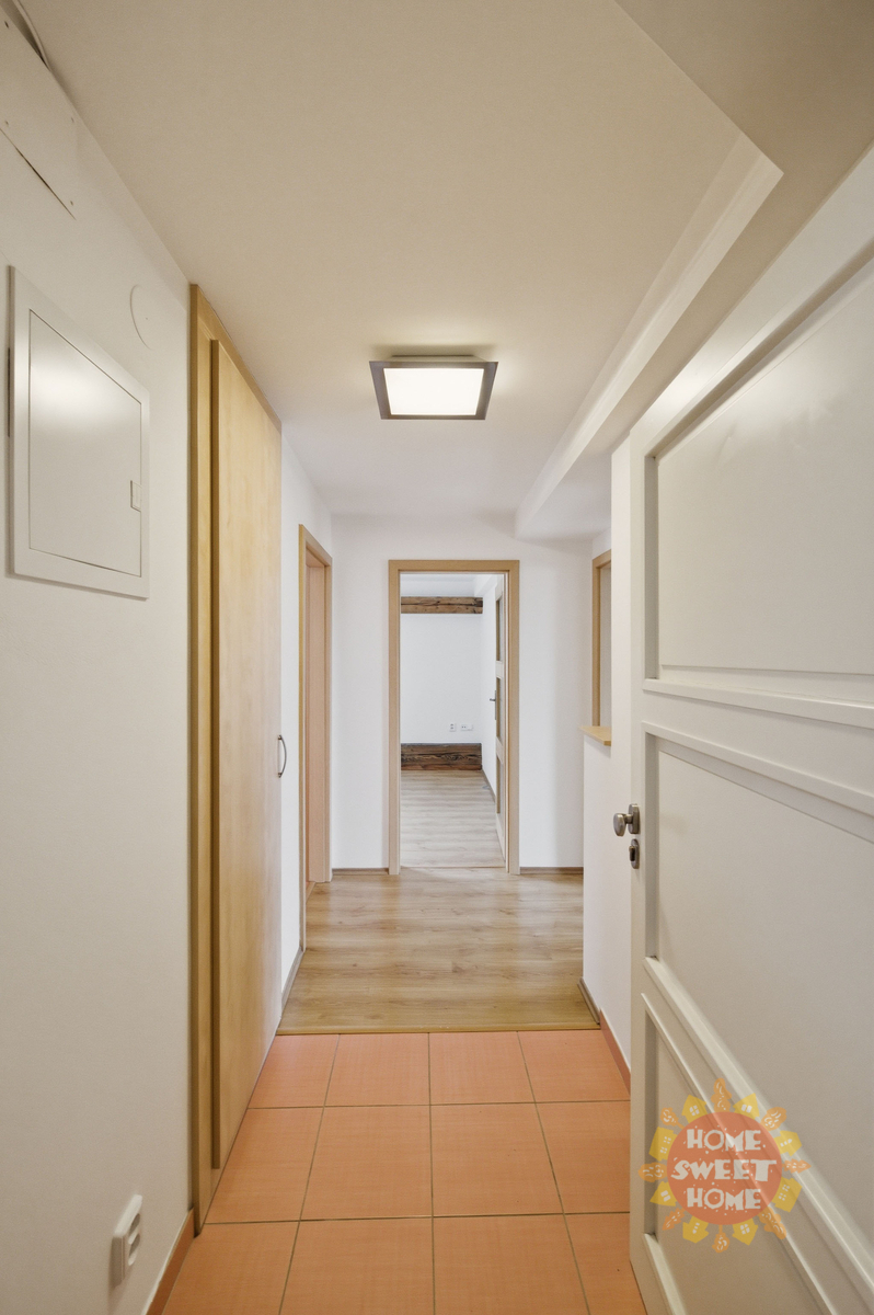 menší vstupní chodba, obývací pokoj s kuchyňskou linkou vybavená všemi spotřebiči (sklokeramická deska, trouba, myčka, mikrovlnka a lednice), ložnice, koupelna s vanou, toaletou a pračkou. Plovoucí podlahy a dlažba, topení zajišťuje vlastní plynový kotel a k dispozici je sklep. Nové fotografie se připravují.