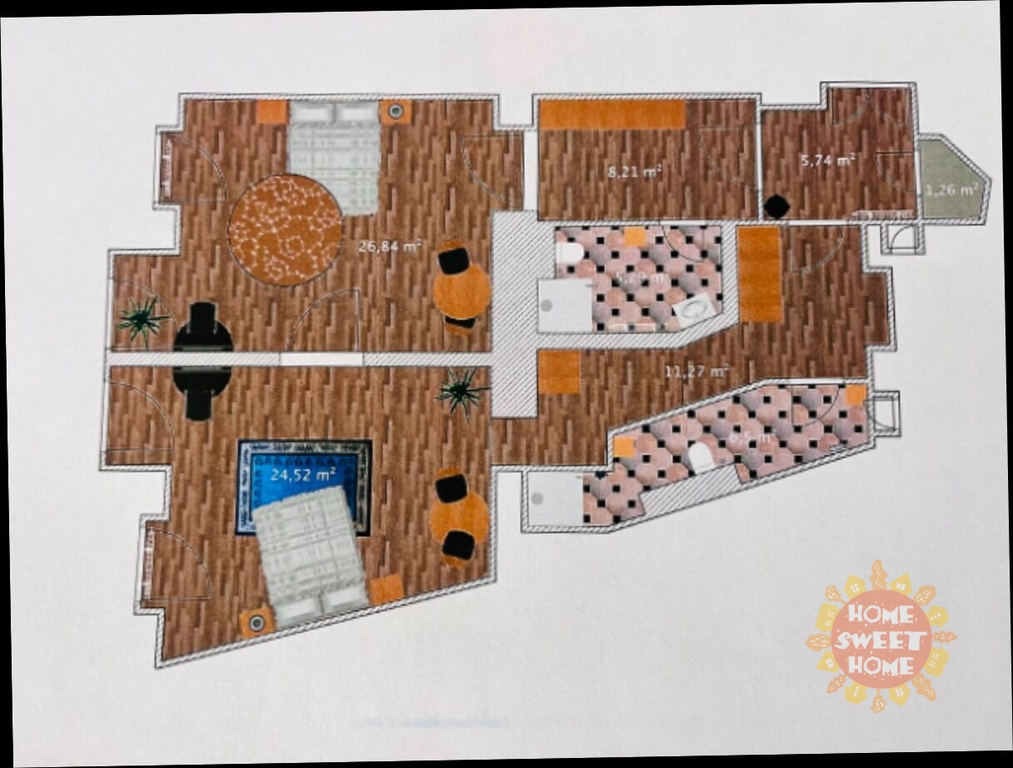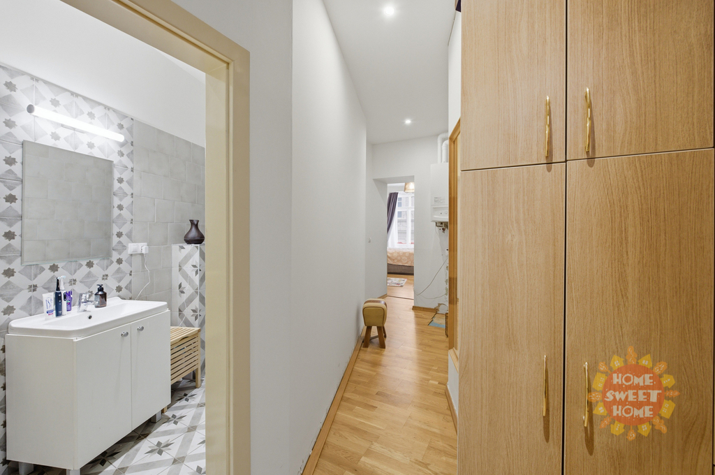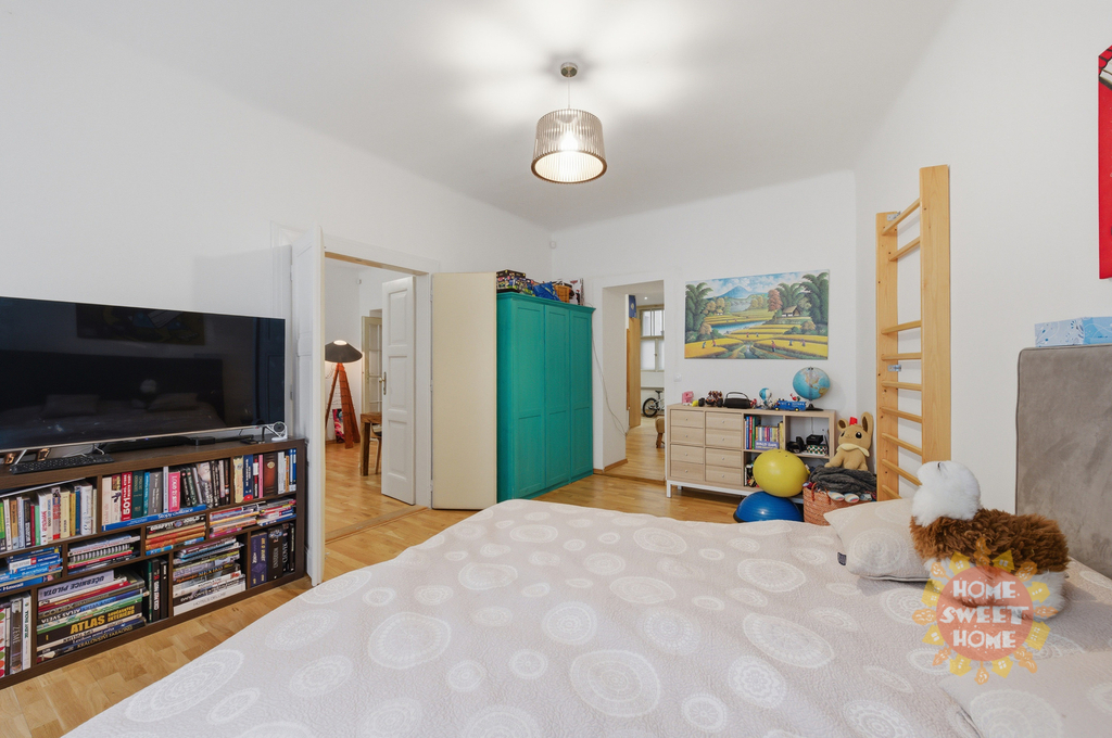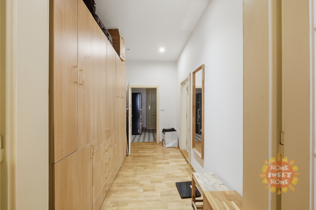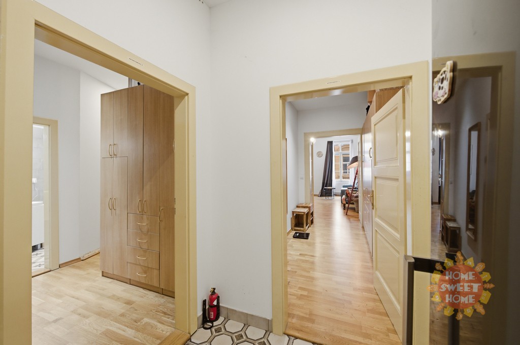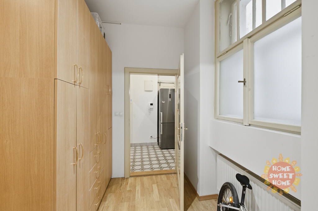 Bytová jednotka je členěna na dva samostatné apartmány o rozloze přibližně 45 m², které jsou spojeny průchozími odhlučněnými křídlovými dveřmi. Každý apartmán disponuje vlastní koupelnou s WC a chodbou se zabudovanými skříněmi, což poskytuje ideální podmínky pro pohodlné bydlení. Historické výklenky s dvěma okny s dvojskly v každém pokoji zajišťují dostatečné množství denního světla.