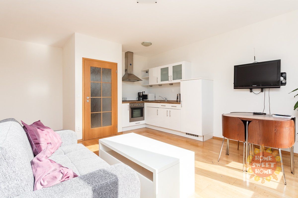 Byt je zařízen nábytkem, vybavená kuchyňská linka, TV a pračka. K bytu patří prostorná, na JIH orientovaná terasa 16m2 s fantastickým výhledem (od Žižkovské věže až k Hradu).