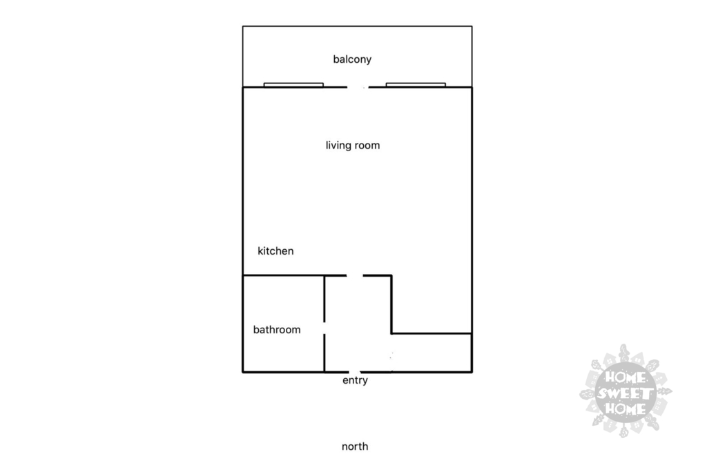 Přesto, že se jedná o 1kk, dispozice bytu je koncipována tak, že je prostor rozdělen na sekce: hned u vchodu šatní kout, v hlavní místnosti spací kout, kuchyňský kout je také částečně vyčleněn.