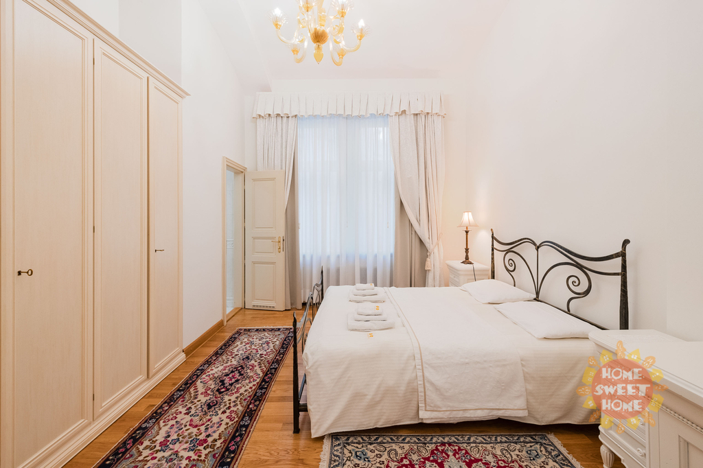 Byt je plně zařízený a nabízí obývací pokoj s pohodlnými pohovkami, křeslem, konferenčním stolkem a televizí. Kuchyň s jídelnou je vybavena troubou, sklokeramickou deskou, lednicí s mrazákem, myčkou nádobí, mikrovlnnou troubou a jídelním stolem. Obě ložnice mají postele, noční stolky a úložné prostory; první ložnice je světlá a elegantní, druhá prostorná s dvoukřídlými dveřmi. Byt disponuje dvěma koupelnami – jedna s vanou a toaletou, druhá se sprchovým koutem a bidetem. K dispozici je také internetové připojení. K bytu je možno si pronajmout garážové parkovací stání v nákupním centru Kotva.