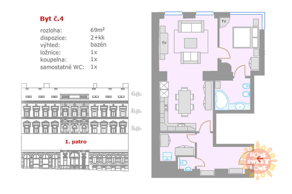 | Dispozice/podlahová plocha: | 2+kk/72 m² |