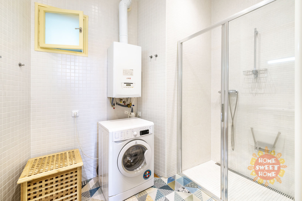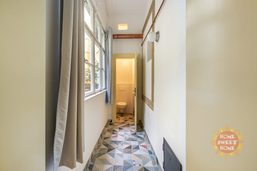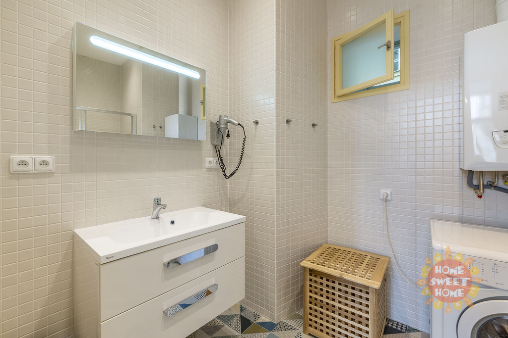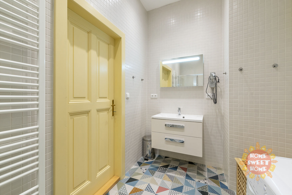 Dispozice bytu nabízí prostorný obývací pokoj, ložnici, kuchyni vybavenou troubou a sporákem, myčkou, mikrovlnnou troubou, lednicí s mrazákem, nádobím, varnou konvicí a kávovarem, koupelnu s vanou a pračkou, toaletu a vstupní halu. Topení a ohřev vody zajišťuje vlastní plynový kotel. V byte jsou zajímavé barokní klenby. Na podlahách dřevěný masiv a dlažba.
