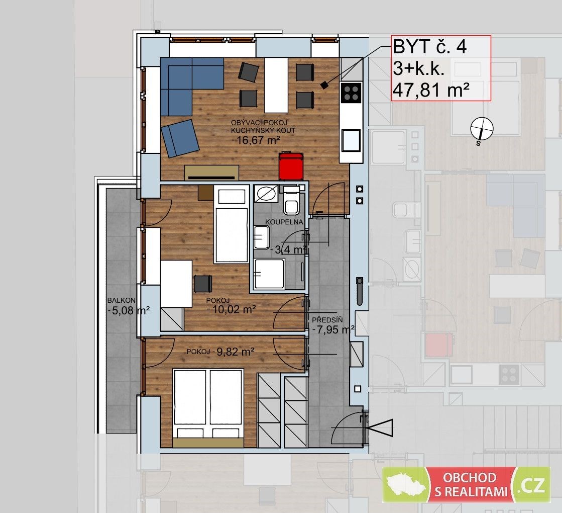 - Dispozice bytu: 3+kk