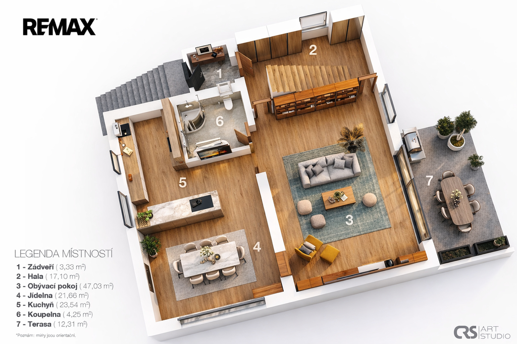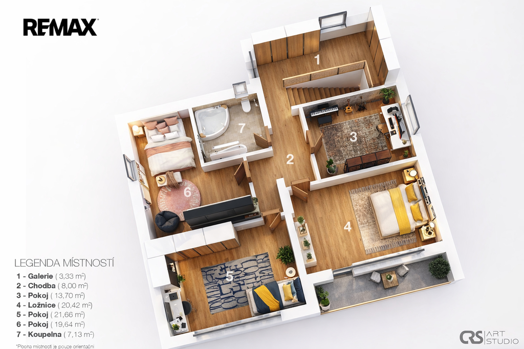 Dispozice na třech podlažích je praktická i pro kombinaci funkcí (rodinné bydlení + práce, dlouhodobé/korporátní ubytování, vícegenerační režim apod.).