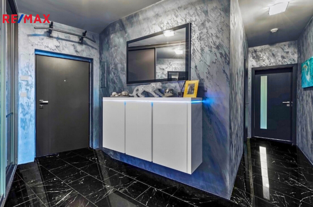 Samozřejmostí jsou nadstandardní materiály: lesklé benátské štuky, italský mramor v předsíni, rozsáhlá skleněná skříň se zrcadlem, skleněné dotykové vypínače a zásuvky. Antracitová koupelna s podsvícenými nikami a rohovou vanou je skutečnou třešničkou na dortu.