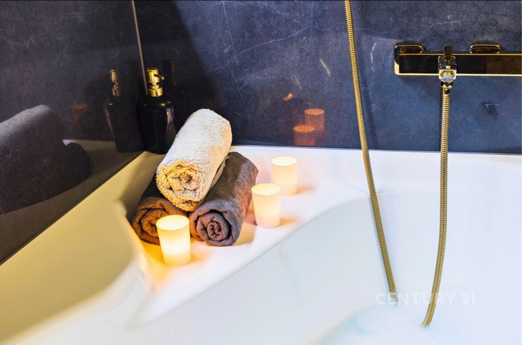 Samozřejmostí jsou nadstandardní materiály: lesklé benátské štuky, italský mramor v předsíni, rozsáhlá skleněná skříň se zrcadlem, skleněné dotykové vypínače a zásuvky. Antracitová koupelna s podsvícenými nikami a rohovou vanou je skutečnou třešničkou na dortu.