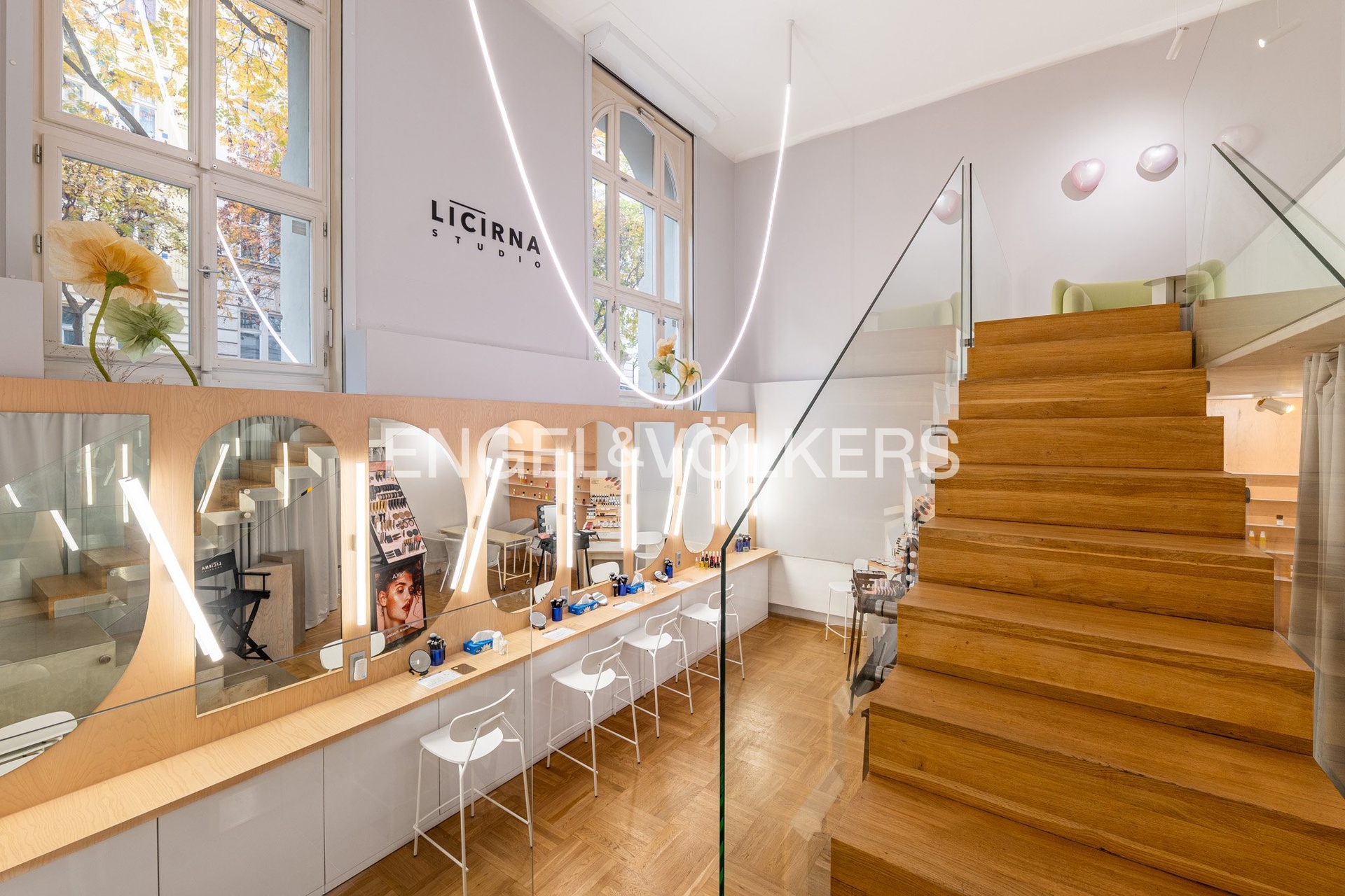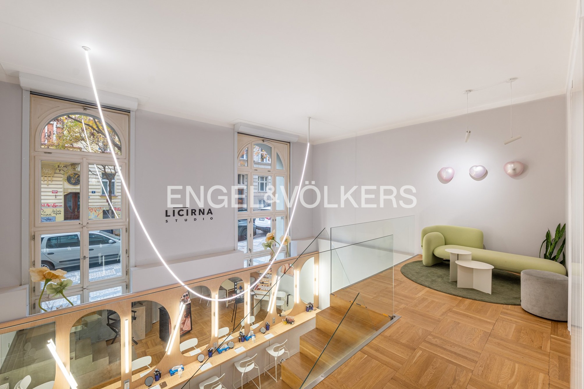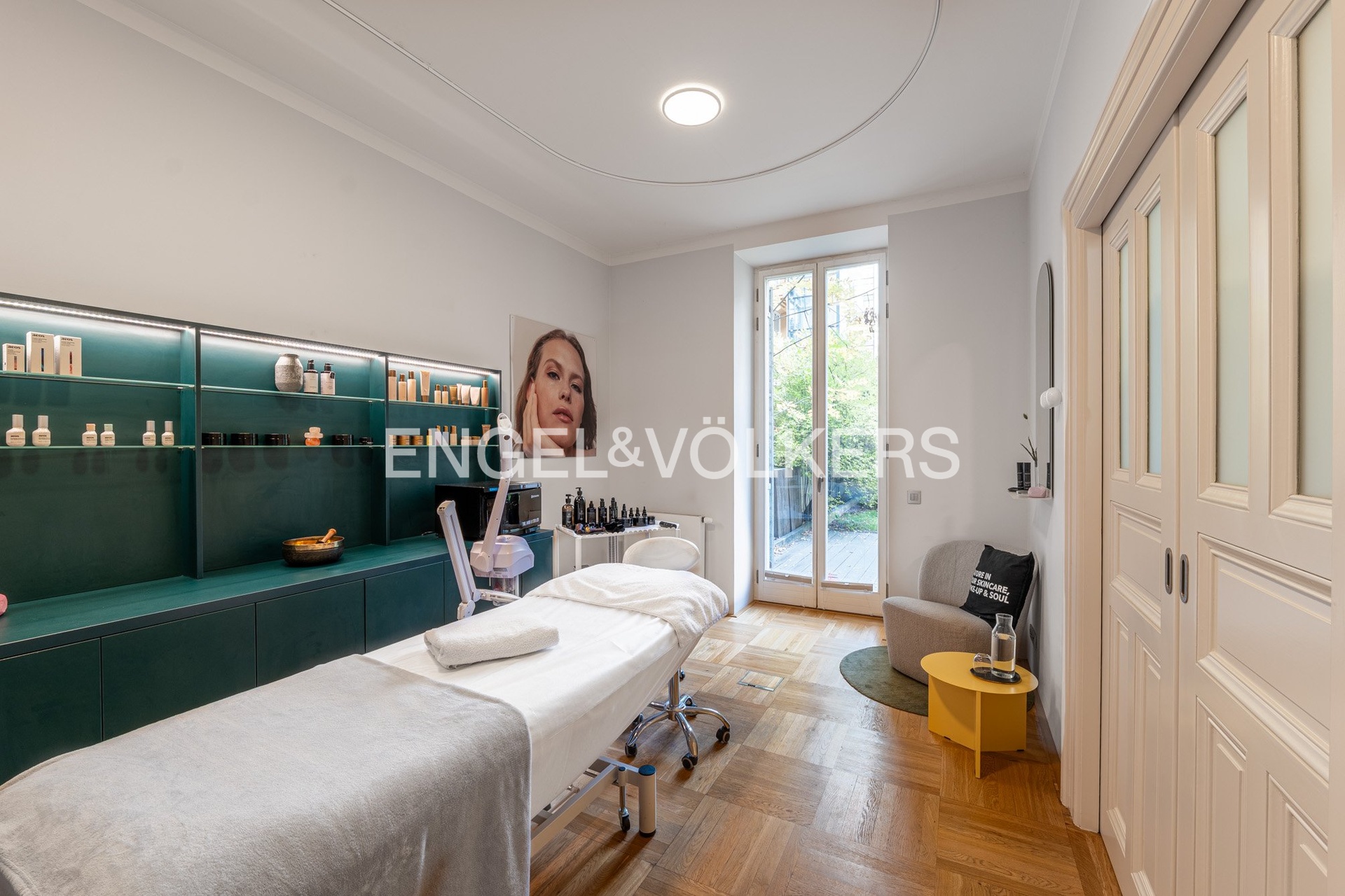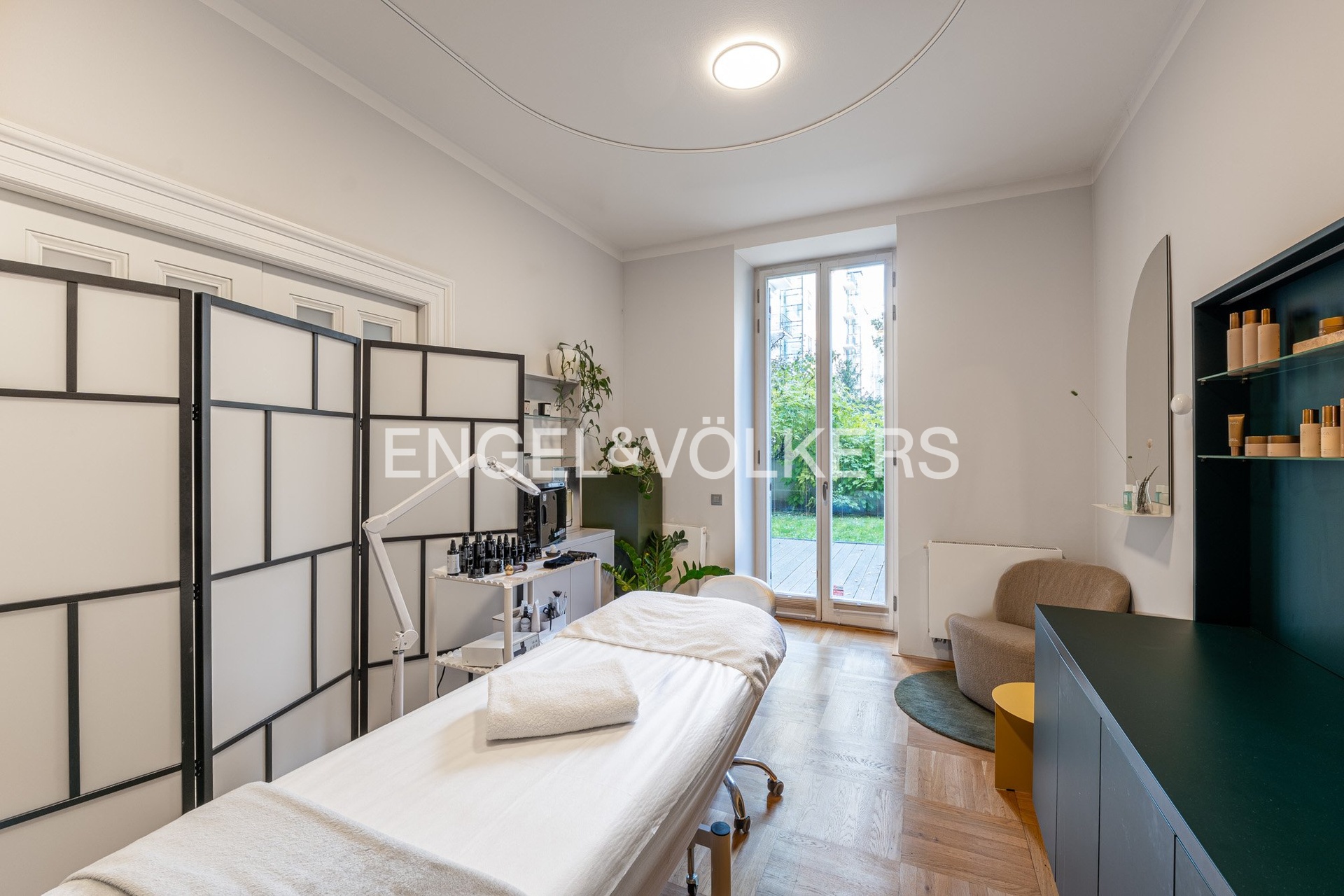 Jednotka o vnitřní užitné ploše 108 m² má vstup z reprezentativních společných prostor a je výjimečná svými velkými okny, která se táhnou ze suterénní úrovně až do přízemí, čímž zajišťují dostatek světla. Prostor, který je po rekonstrukci a disponuje dřevěnými okny a podlahami a vlastním plynovým kotlem, je aktuálně využíván jako kosmetické studio s vlastní recepcí, hygienickým zázemím, relaxačními místnostmi a kuchyňkou.