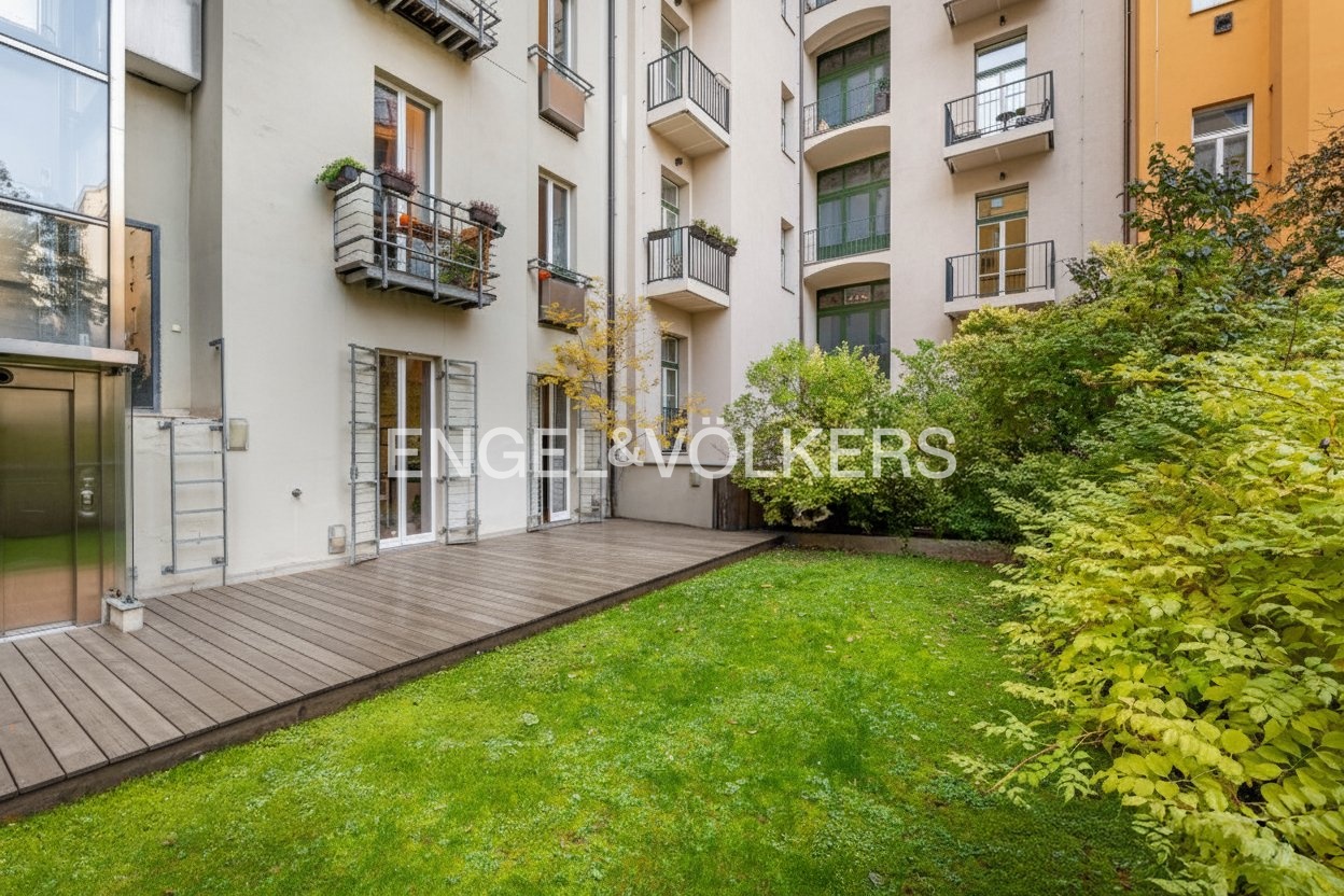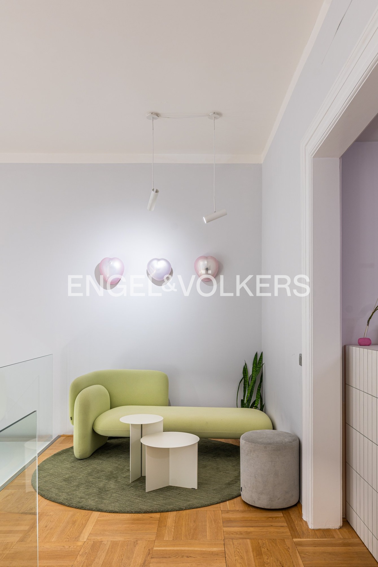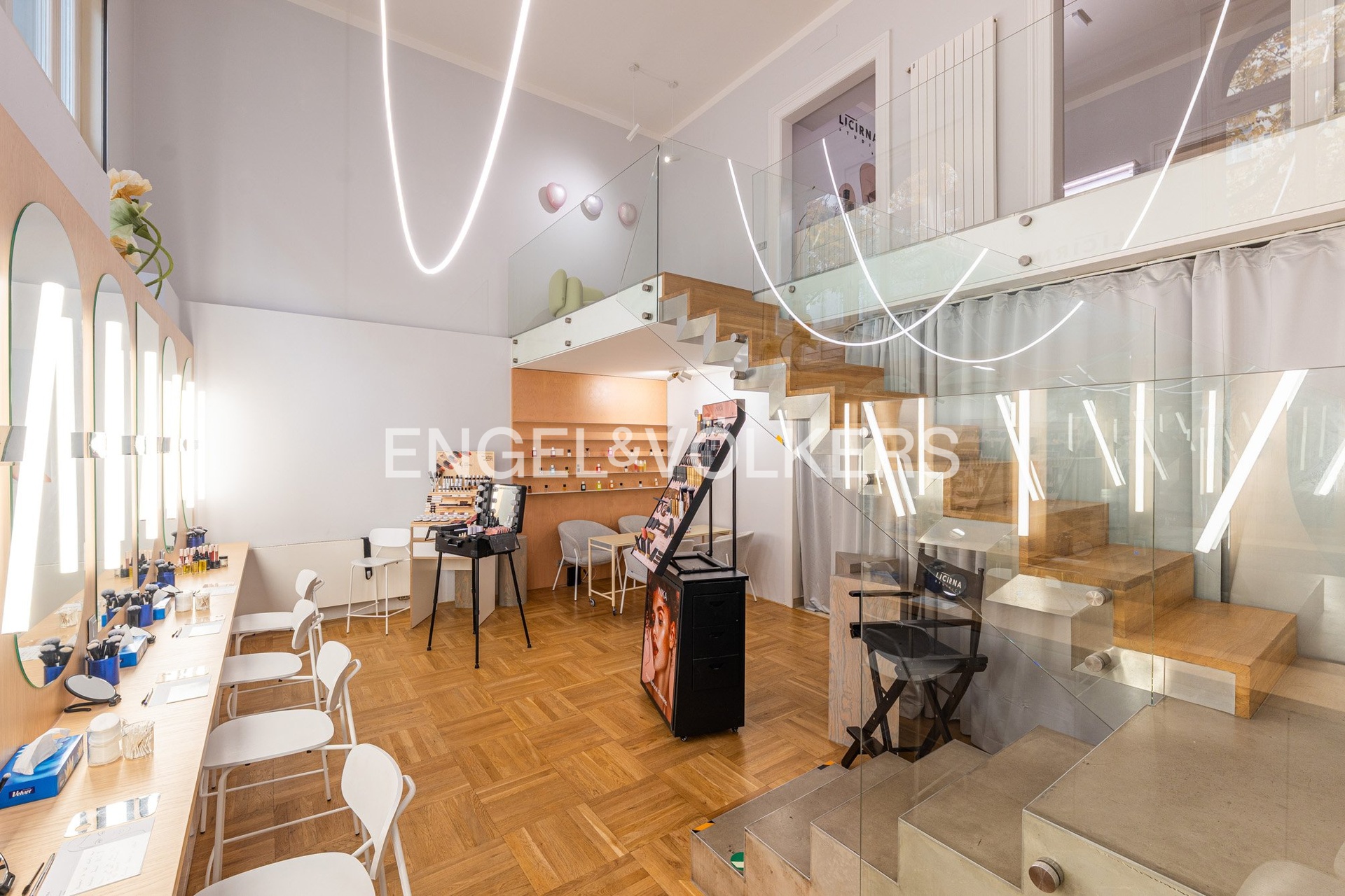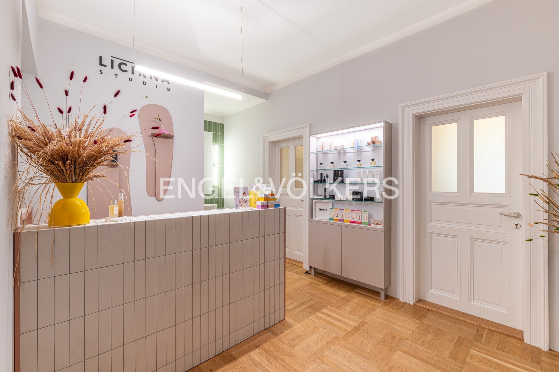 Jednotka o vnitřní užitné ploše 108 m² má vstup z reprezentativních společných prostor a je výjimečná svými velkými okny, která se táhnou ze suterénní úrovně až do přízemí, čímž zajišťují dostatek světla. Prostor, který je po rekonstrukci a disponuje dřevěnými okny a podlahami a vlastním plynovým kotlem, je aktuálně využíván jako kosmetické studio s vlastní recepcí, hygienickým zázemím, relaxačními místnostmi a kuchyňkou.