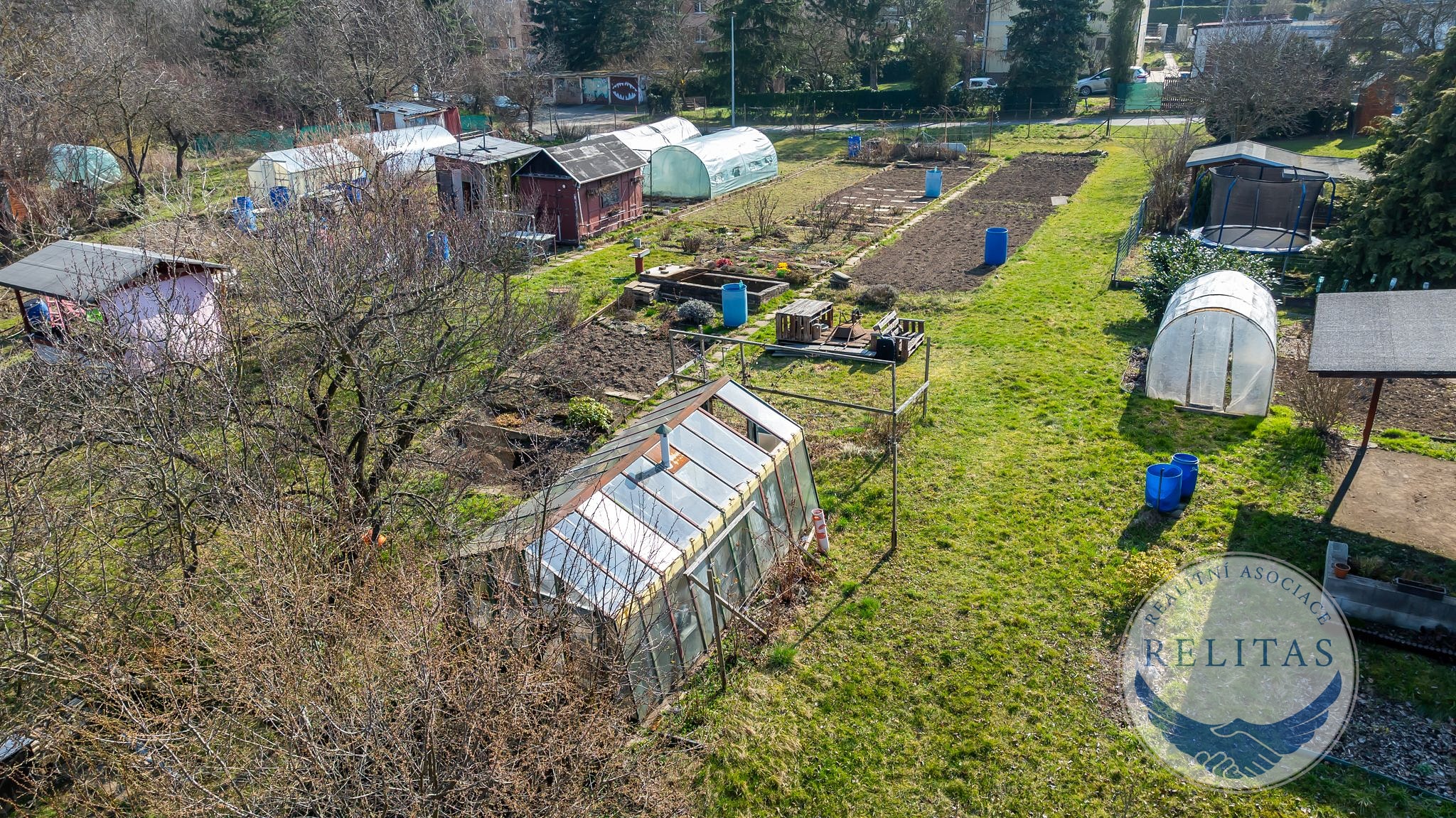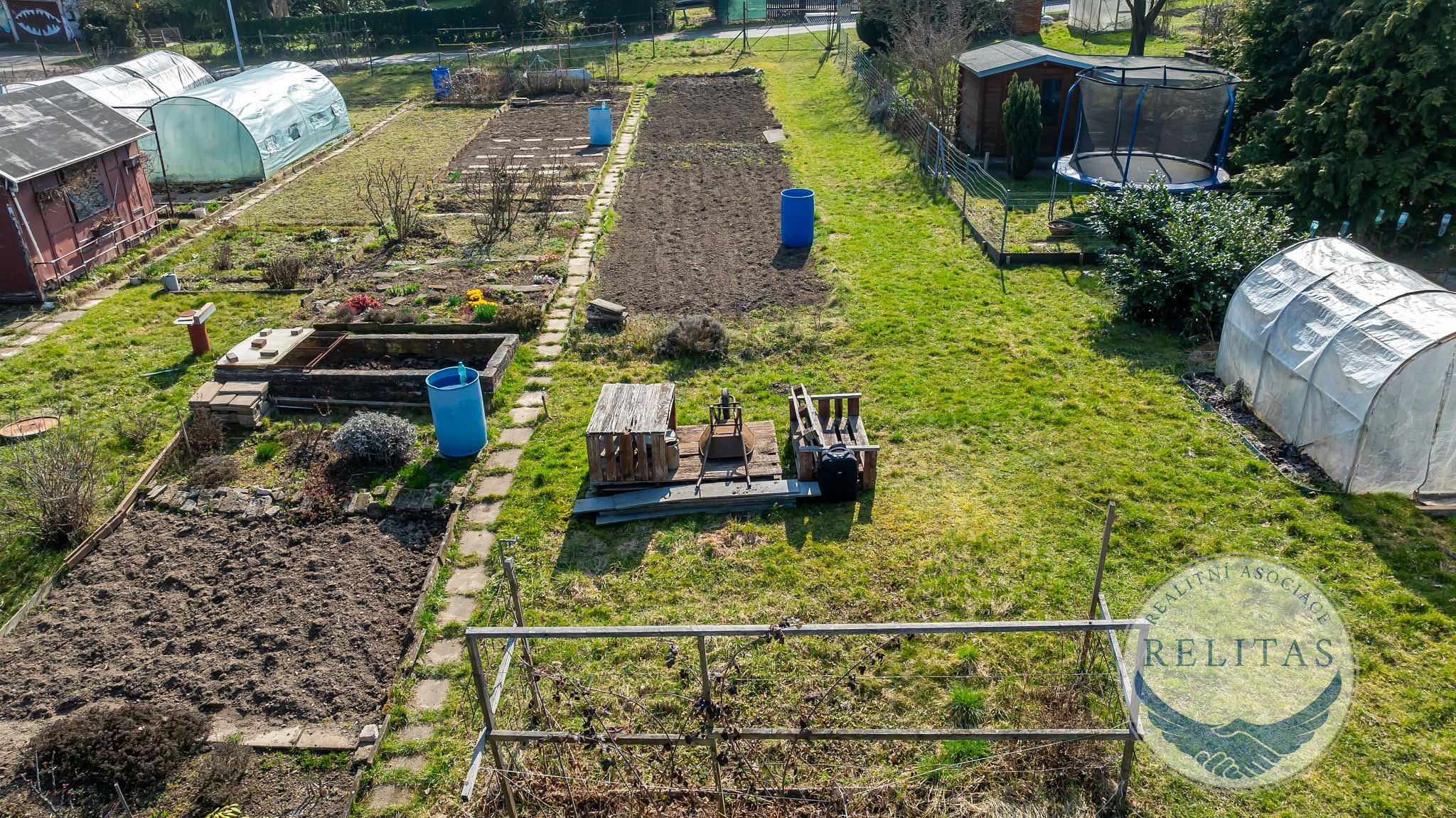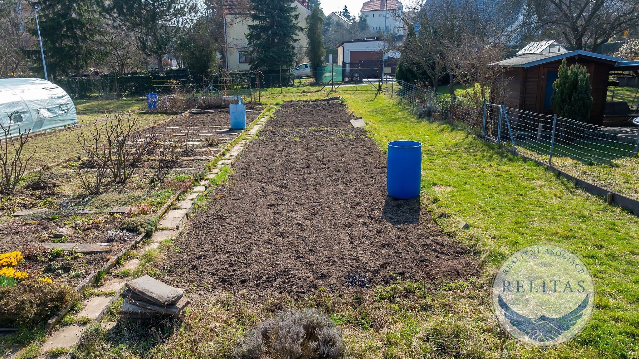 Pozemek je rovinatý, plně oplocený a orientovaný na jižní stranu, díky čemuž je celodenně prosluněný – ideální podmínky pro pěstování zeleniny, ovoce i okrasných rostlin. Půda je pečlivě obhospodařovaná, záhony jsou zorané a připravené k okamžitému využití. Uprostřed pozemku vede zpevněná cestička z obrubníků, která přehledně člení plochu na jednotlivé pěstební zóny.