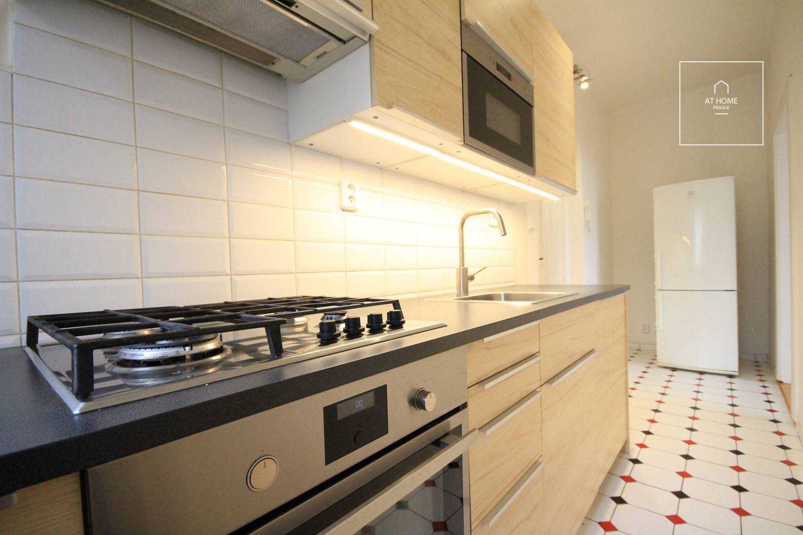 Tyršova čtvrť, hezké bydlení na klidném místě v oblasti s rodinnými domky a vilami. Velice příjemný byt 2+kk, nezařízený (s možností částečně dozařídit) v 1.patře rodinného domu v Modřanech, Praha 4. 52m2: předsíň s vybaveným kuchyňským koutem (plynová varná deska, el. trouba, myčka), obývací pokoj, ložnice. Koupelna s oknem a rohovou vanou, WC. Bojler na teplou vodu, vytápění pro celé patro plynovým kotlem (rozúčtování). Dobrá dopravní dostupnost – tramvaje směr centrum přes Braník, autobusy na metro C (Budějovická, Kačerov) i metro B (Smíchovské nádraží). V místě školy, školky, mezinárodní školy (Prague British International School – 5 min autem), poliklinika, obchodní centra, supermarkety (Billa, Kaufland, Lidl). Nedaleko Modřanská rokle, Kunratický les, cyklostezky, sportovněkulturní zóna v Braníku s restauracemi. Cena za nájem 18.000,- Kč/měs + 1.000,-/os/měs. za dům (v případě 2 osob) + elektřina a plyn. Nejlépe pro česky mluvícího zájemce, ideálně pro 1 osobu nebo maximálně pro pár. Volné v první polovině února.Volné v první polovině února. Energetický štítek G.