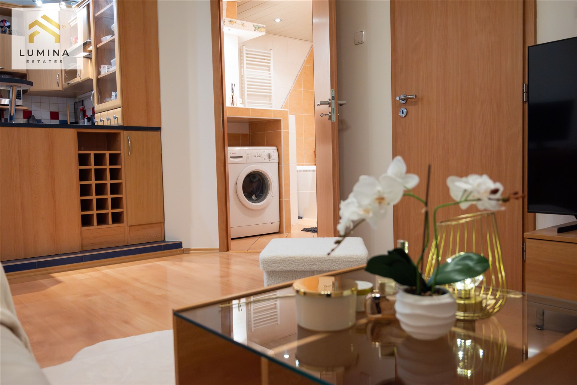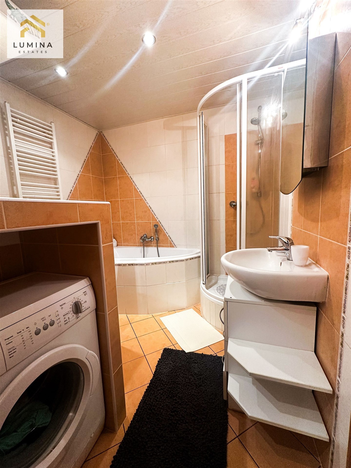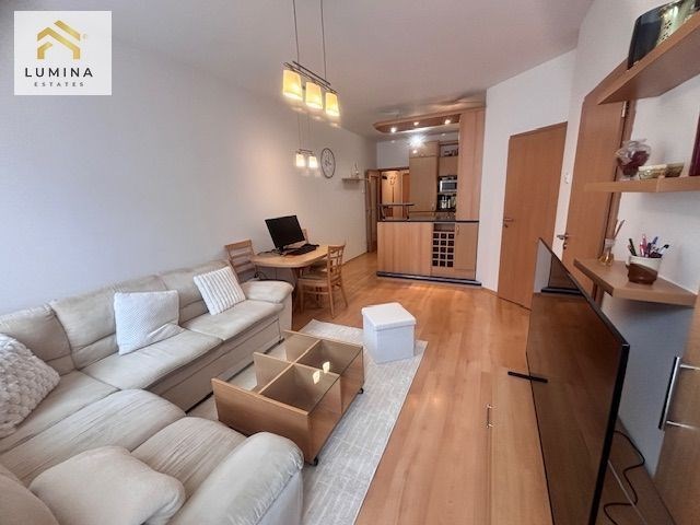 Tento byt nabízí útulný obývací pokoj s kuchyňským koutem, který je plně vybaven moderními spotřebiči včetně vestavěné lednice, mikrovlnné trouby, elektrické trouby, mrazáku a odsavače par. Díky jihovýchodníí orientaci je zde každodenně příjemný přísun světla. Součástí bytu je také klidná ložnice a kvalitně vybavená koupelna.