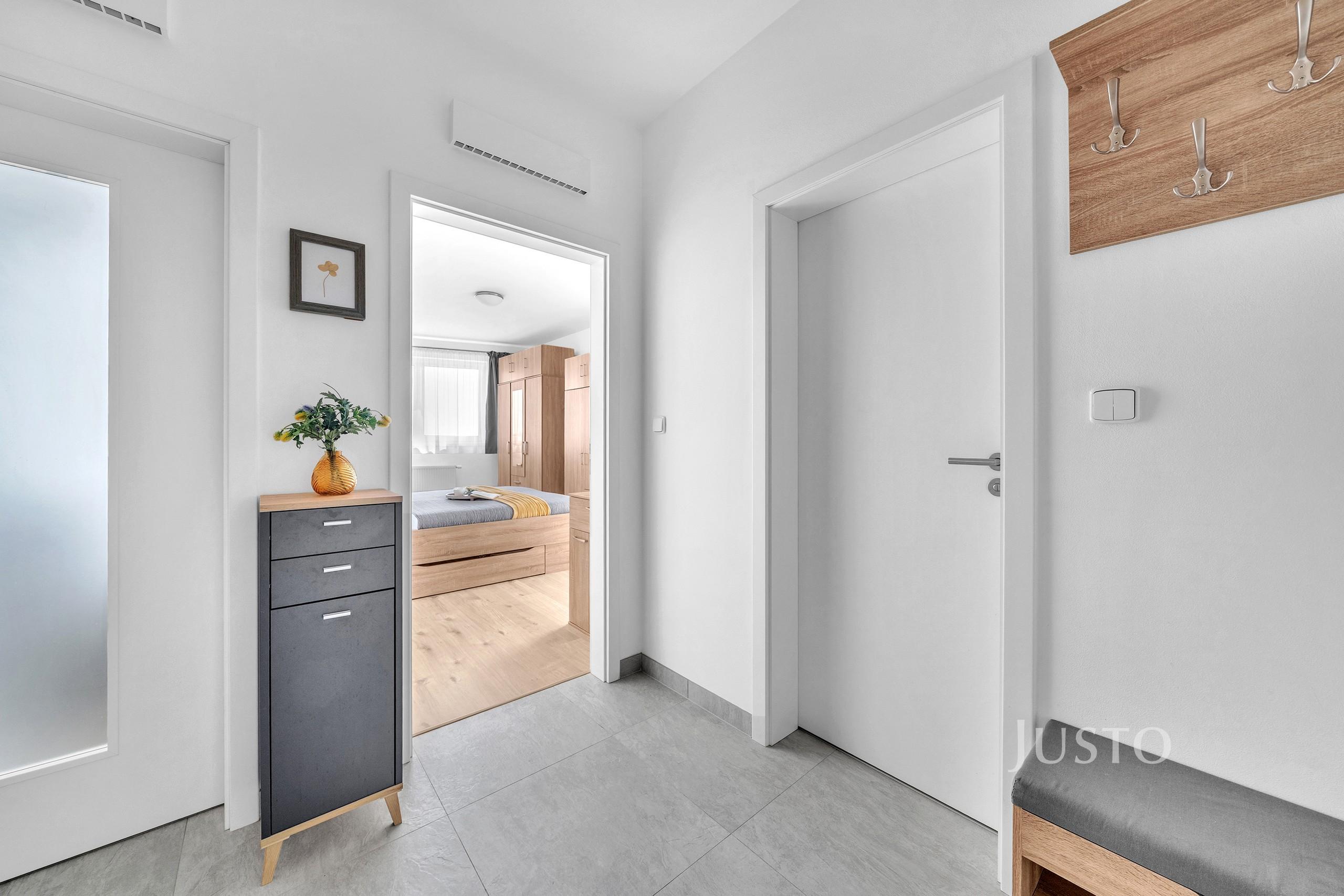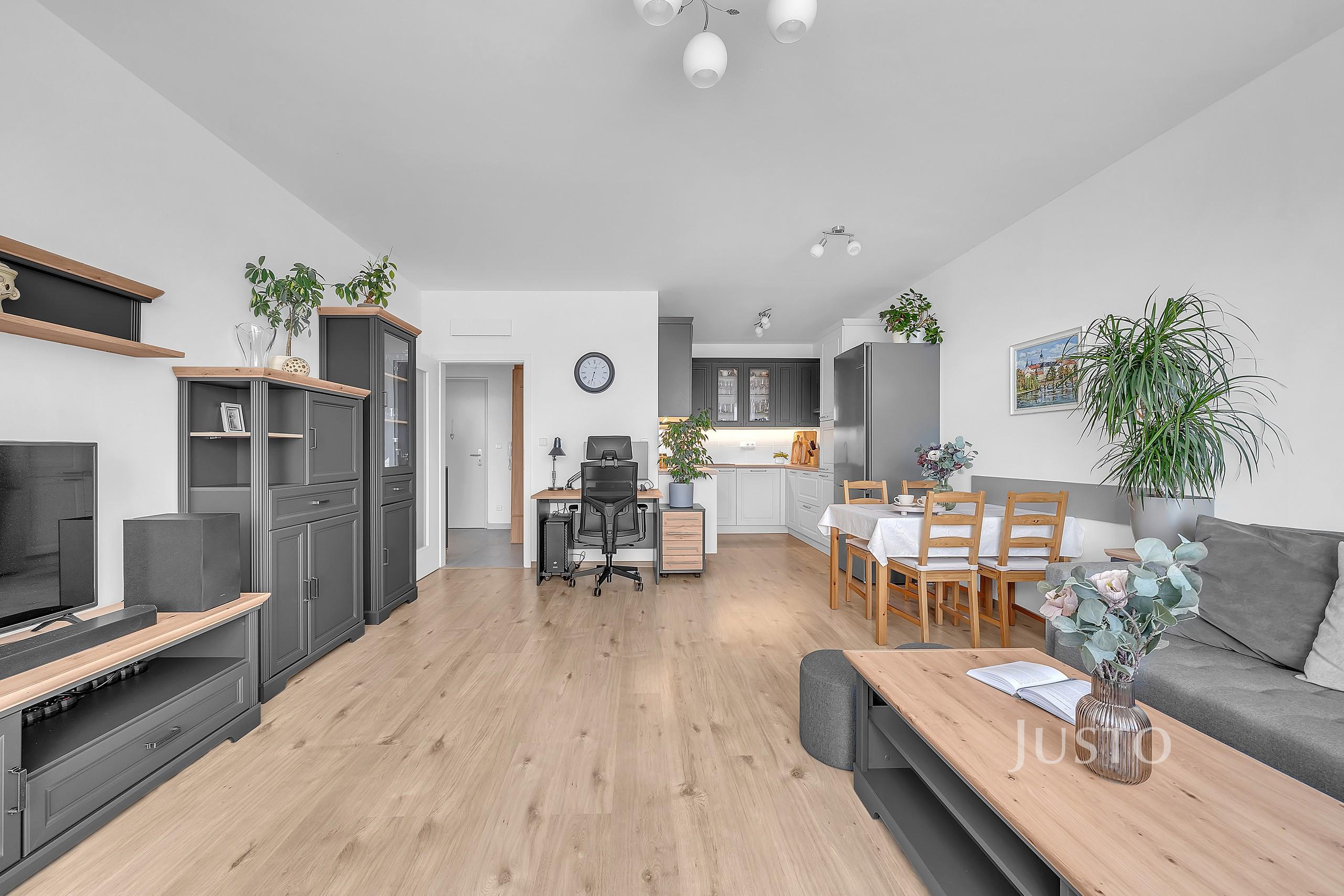 Byt je situován ve 2. podlaží třípatrového domu s výtahem. Dispozice zahrnuje světlý obývací prostor s kuchyňským koutem, který je vybaven kvalitní kuchyňskou linkou s vestavěnými spotřebiči včetně myčky, elektrické trouby a varné desky. Byt je částečně vybaven, což umožňuje novému majiteli dotvořit si interiér podle vlastních představ.