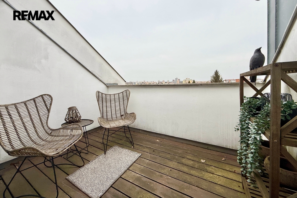 Z ložnice je vstup na terasu o velikosti 6 m², která nabízí příjemné soukromí a výhled do klidné ulice se zelení. Místo, kde si ráno v klidu dáte kávu a večer si odpočinete od ruchu města.