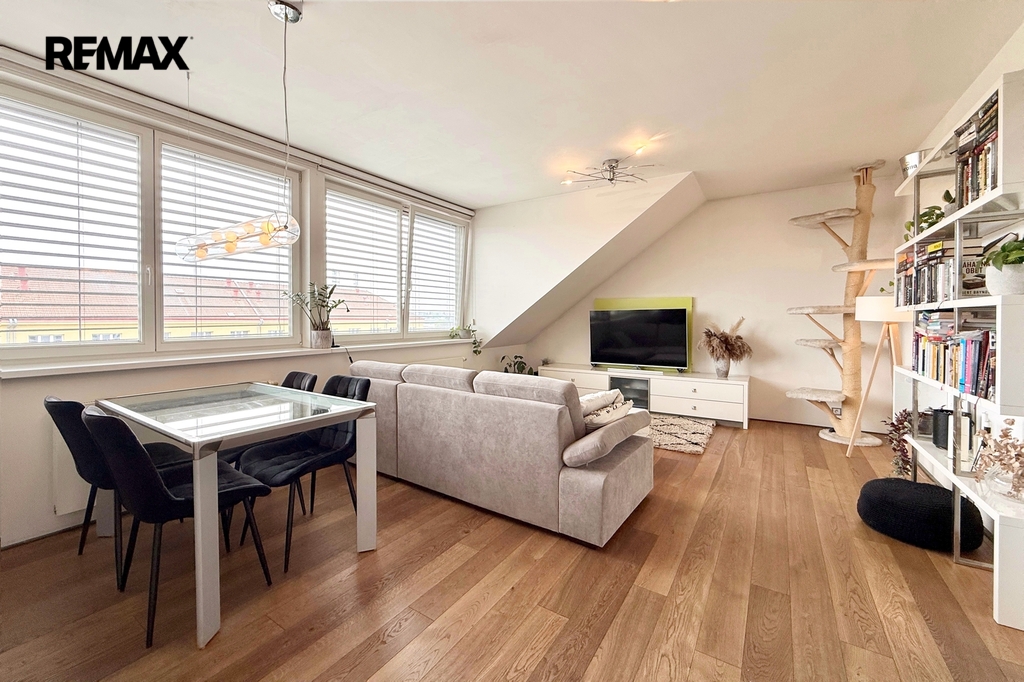 Byt se nachází v nástavbě cihlového domu z roku 2011 a už při prvním vstupu vás zaujme vzdušný obývací prostor s kuchyňským koutem, který díky velkým oknům působí otevřeně a přirozeně prosvětleně. Prostor je ideální pro každodenní život i setkávání s rodinou či přáteli.