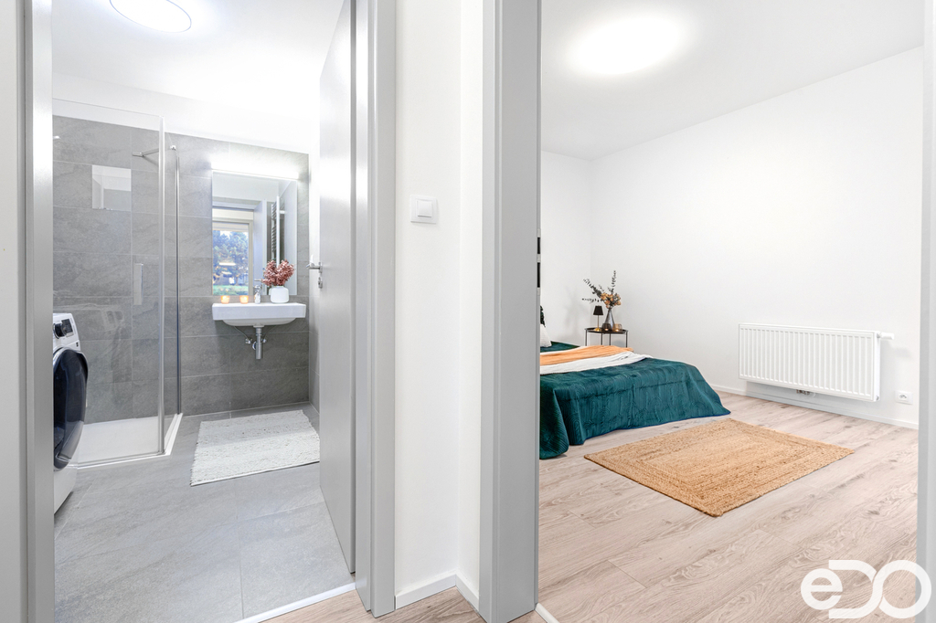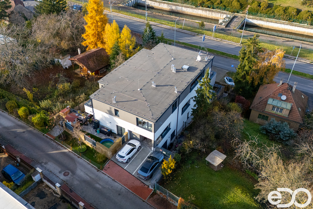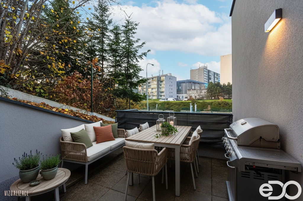 Jednotka se skládá z předsíně, obývacího pokoje s kuchyňským koutem, dvou samostatných ložnic (obě se vstupem na terasu), koupelny se sprchovým koutem a toaletou, další samostatné toalety s umyvadlem a rozměrné komory, která může sloužit jako šatna či jiný úložný prostor. Jednotka se nabízí nezařízená nábytkem. V nové kuchyni, která je vestavěná na míru, se nachází veškeré moderní spotřebiče značky Siemens: indukční varná deska s digestoří, elektrická trouba, mikrovlnná trouba, vestavěná myčka a vestavěná lednice s mrazákem. V koupelně je umístěna kombinovaná pračka se sušičkou značky Samsung. Plastová okna a terasové dveře zajišťují dobré tepelně-izolační vlastnosti, podlahy jsou laminátové plovoucí a keramická dlažba. Vytápění je centrální, plynová kotelna se nachází přímo v domě. Celou nemovitost si můžete projít v pohodlí svého domova prostřednictvím virtuální prohlídky, která je součástí propagace.