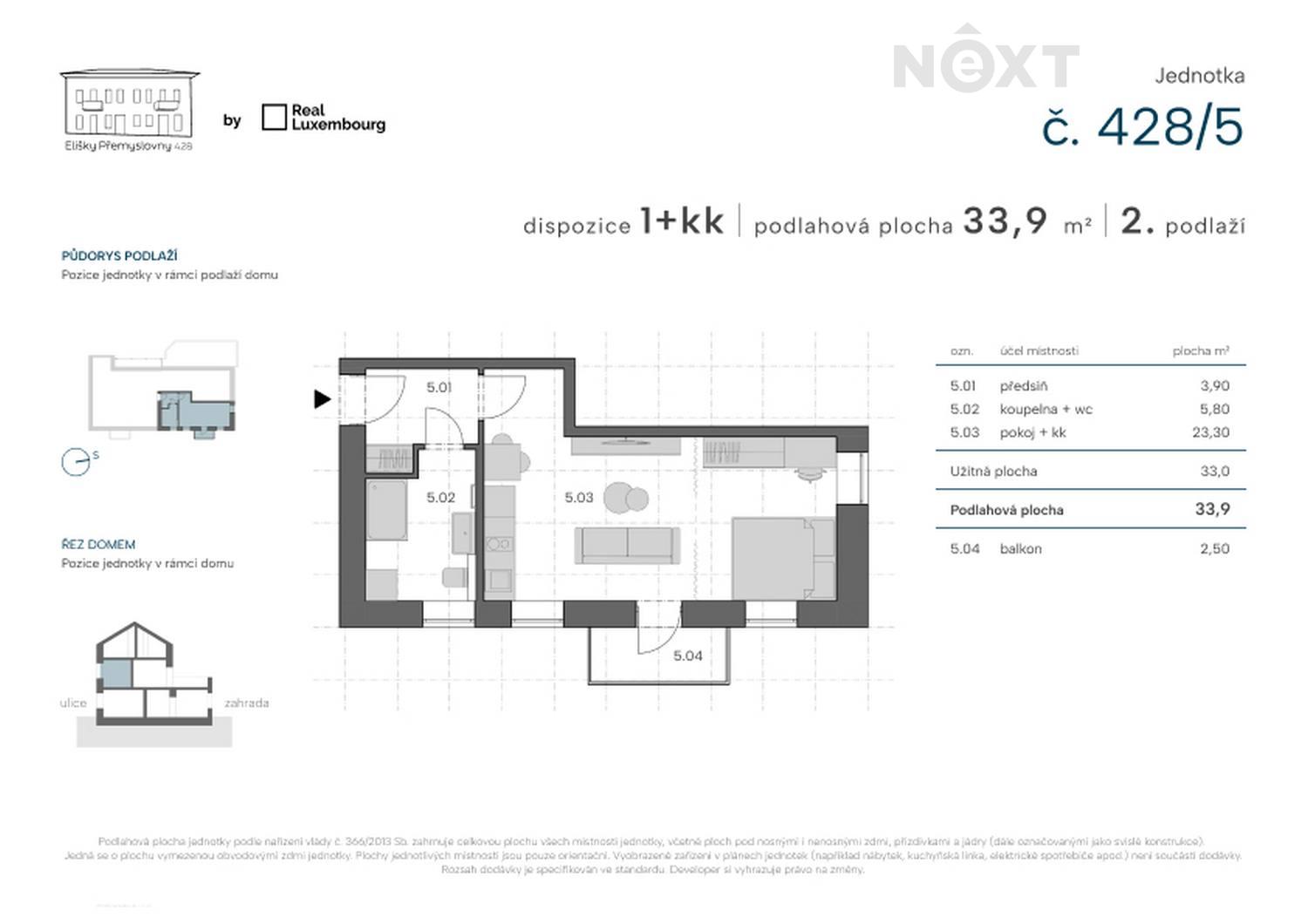 | Dispozice/podlahová plocha: | 1+kk/34 m² |