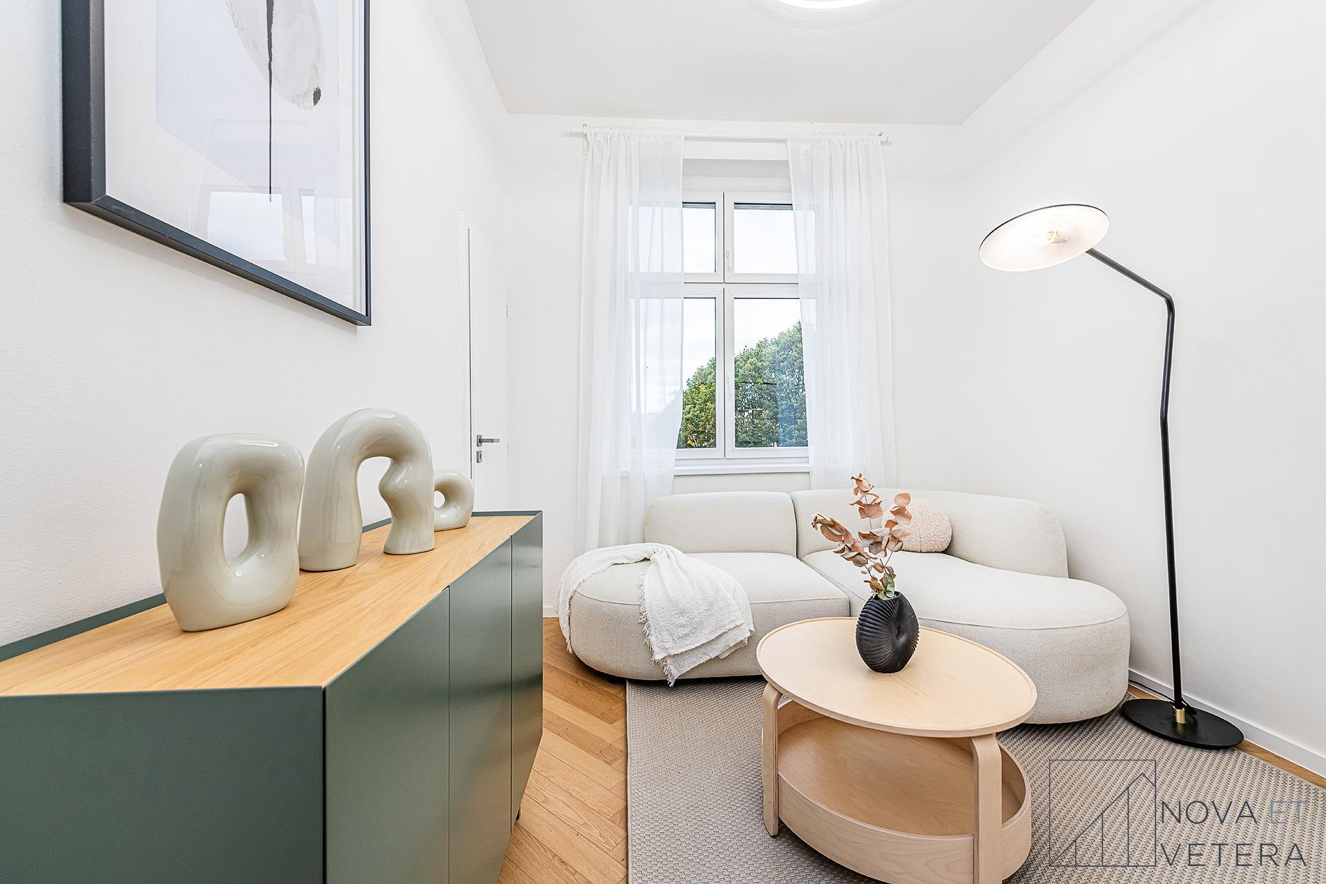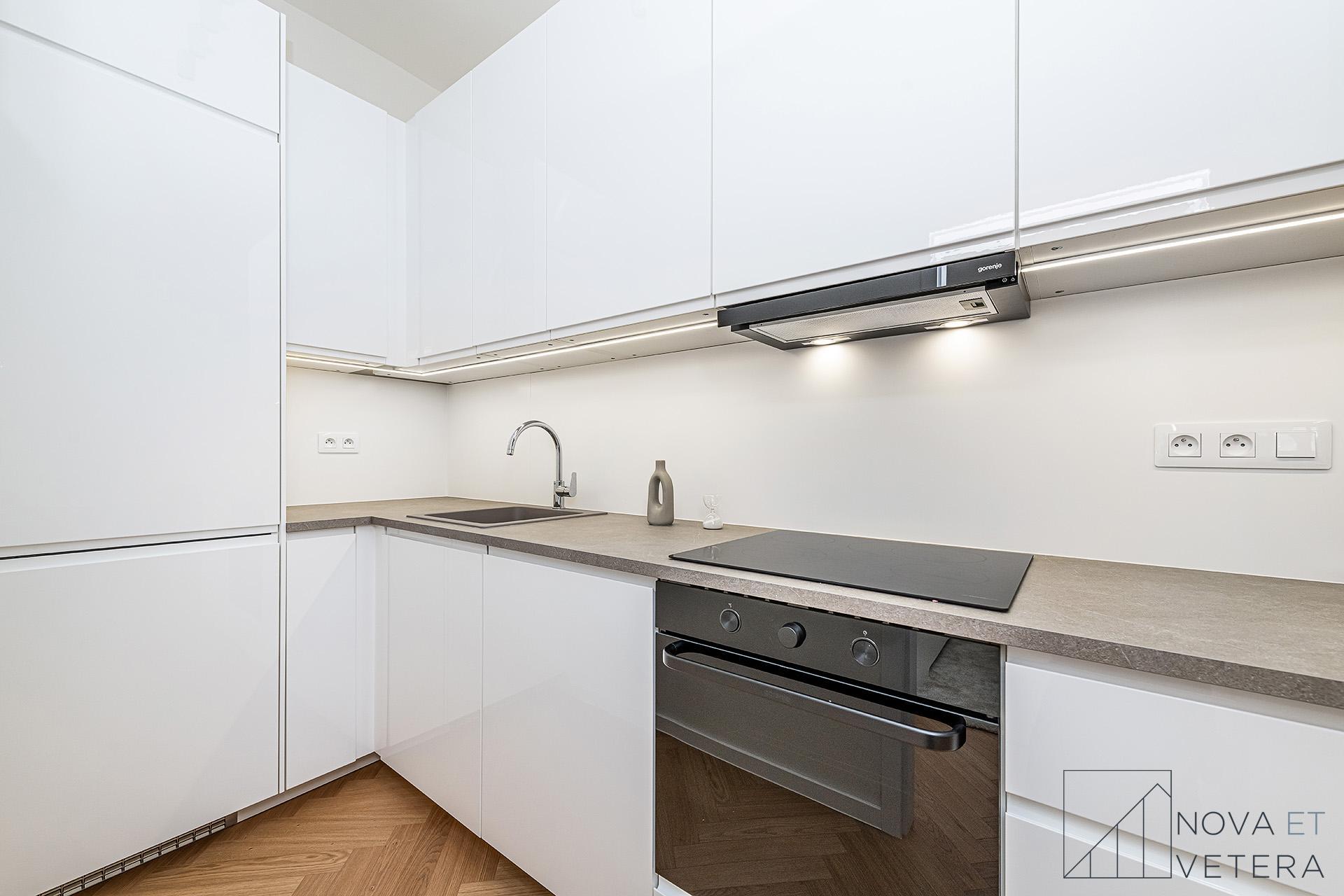 Byt právě prošel kompletní rekonstrukcí, která zahrnuje nové rozvody elektřiny, vody a odpadů, moderní podlahové krytiny, nová okna, obklady a sanitu. Součástí je také kuchyňská linka vybavená spotřebiči prémiové značky Bosch.