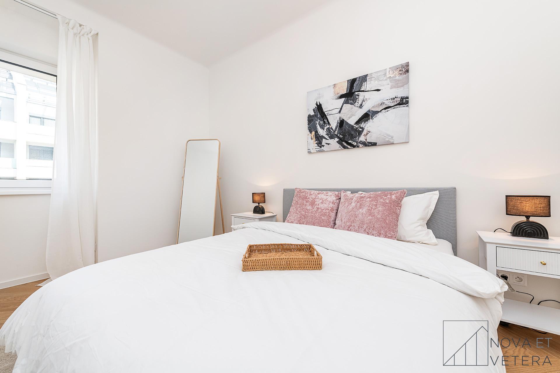 Dispozice nabízí prostorný světlý obývací pokoj s plně vybaveným kuchyňským koutem, samostatnou ložnici se vstupem na balkon, koupelnu se sprchovým koutem a toaletou. Vstupní chodba nabízí s dostatkem místa pro úložné řešení. Byt je orientován na západ, což zajišťuje dostatek odpoledního a večerního světla a příjemnou atmosféru během dne. Výhled směřuje do klidné společné zahrady.