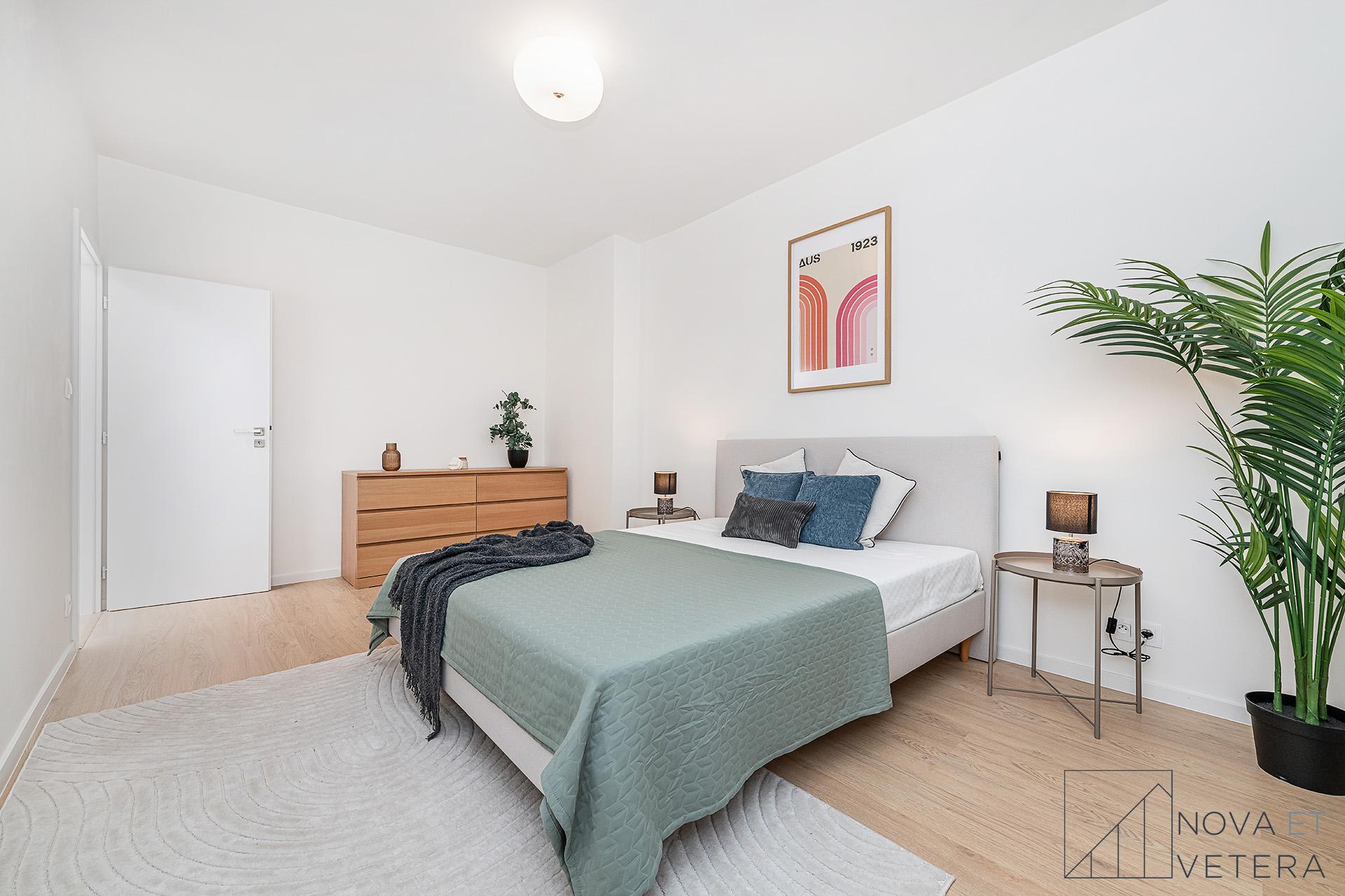 Dispozičně byt nabízí obývací pokoj s kuchyňským koutem, dva samostatné pokoje vhodné jako ložnice a dětský pokoj nebo pracovna, prostornou vstupní chodbu a moderní koupelnu s toaletou. K bytu náleží sklepní kóje o velikosti 2 m².
