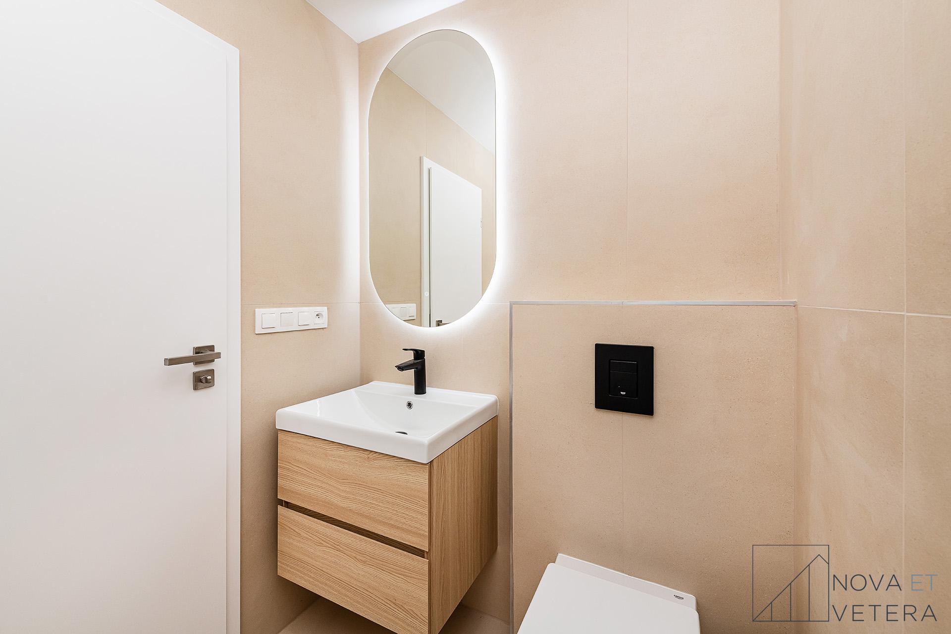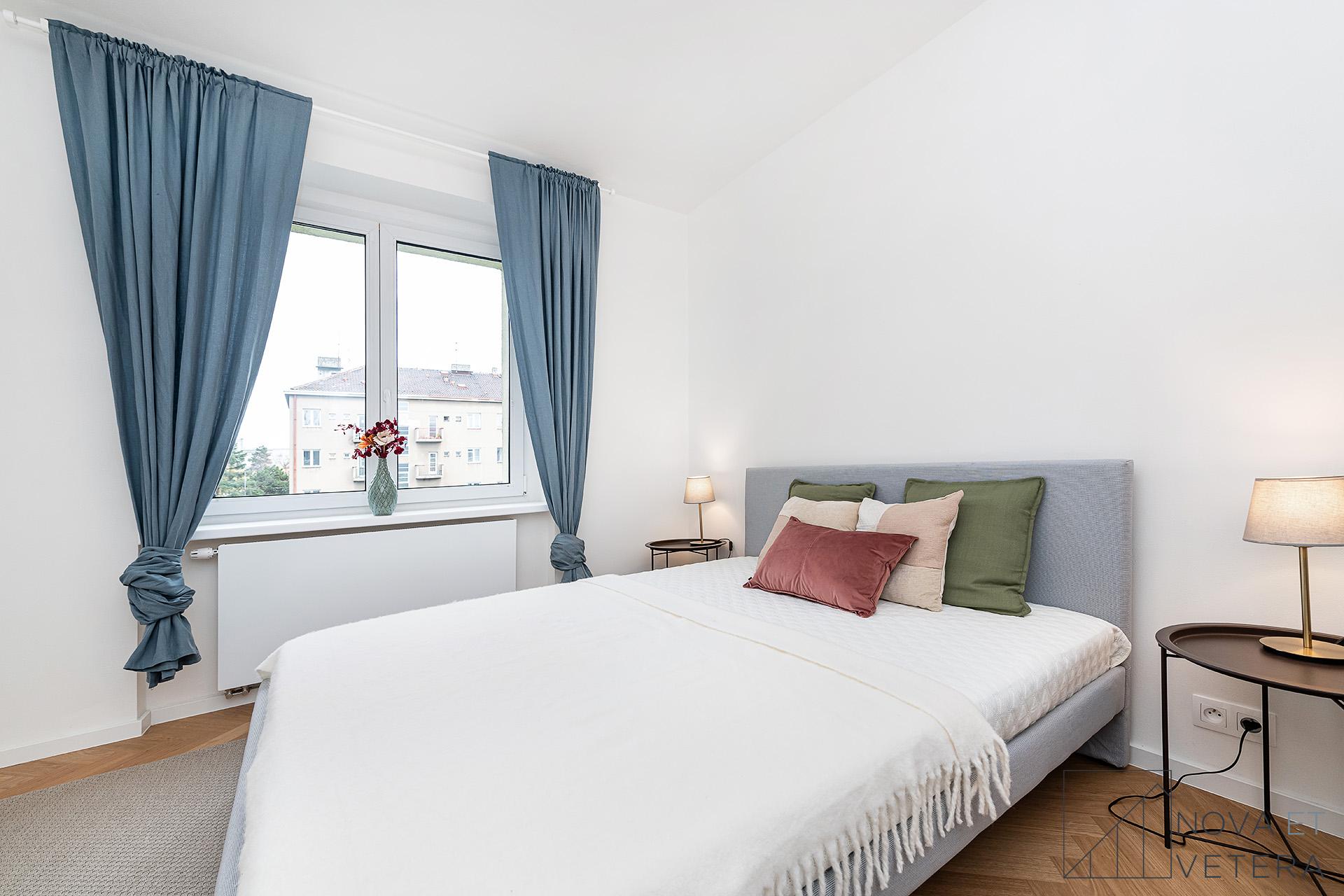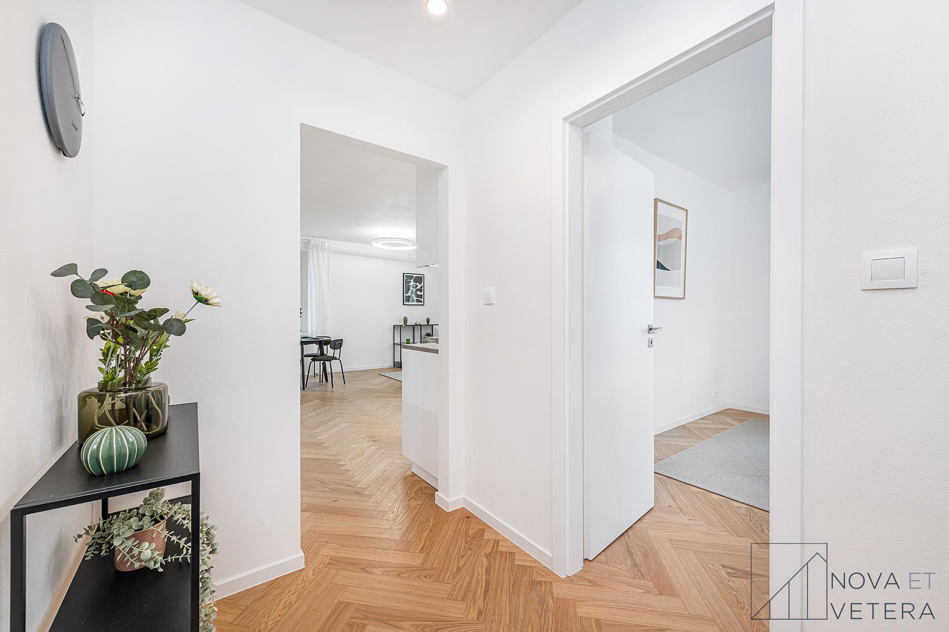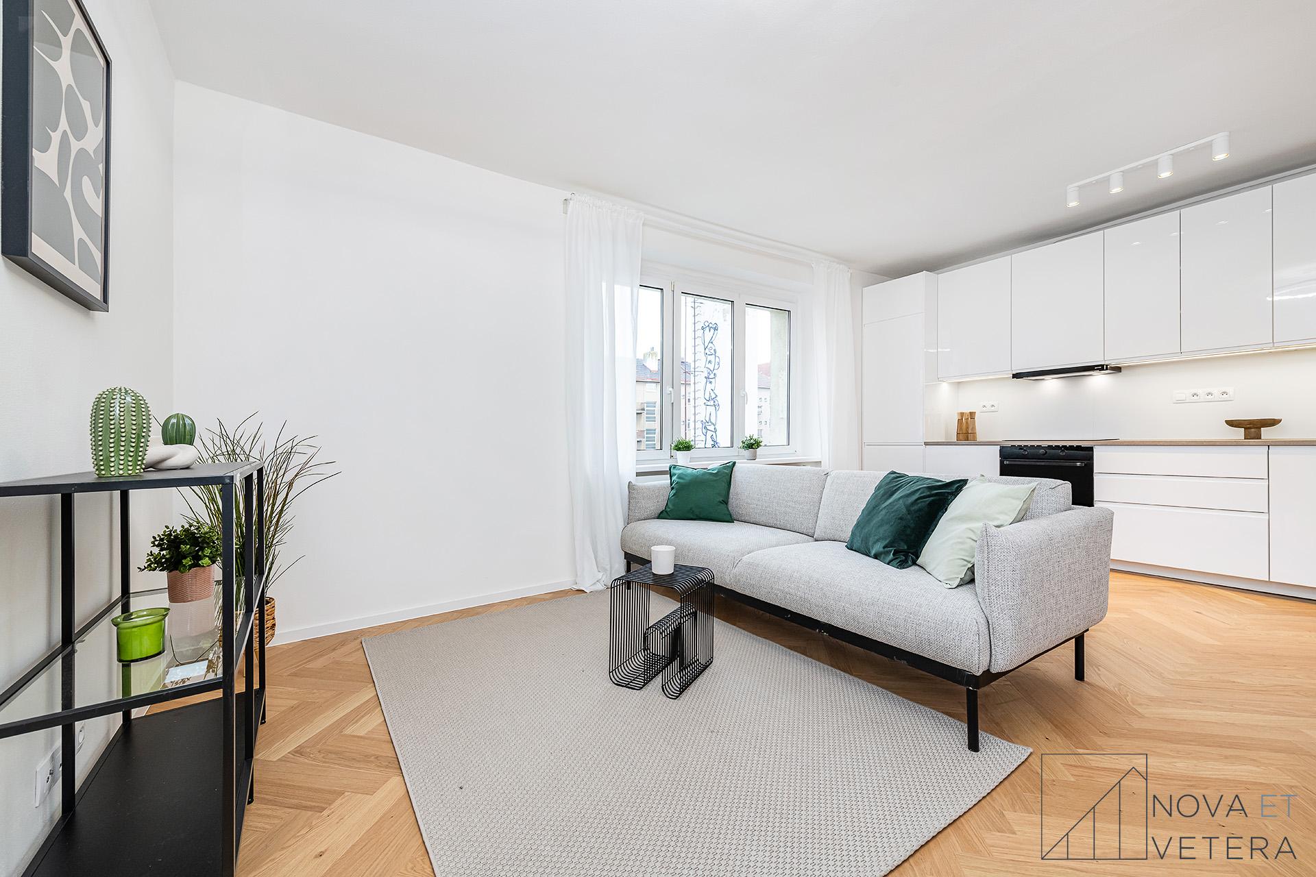 Interiér bytu právě prochází kompletní rekonstrukcí, která zahrnuje nové rozvody elektřiny, vody a odpadu, nové okna, dřevěné podlahy, obklady a dlažby italské značky Marazzi, stejně jako koupelnu a toaletu se sanitou Grohe. Součástí vybavení je kuchyňská linka na míru se spotřebiči prémiové značky Bosch.