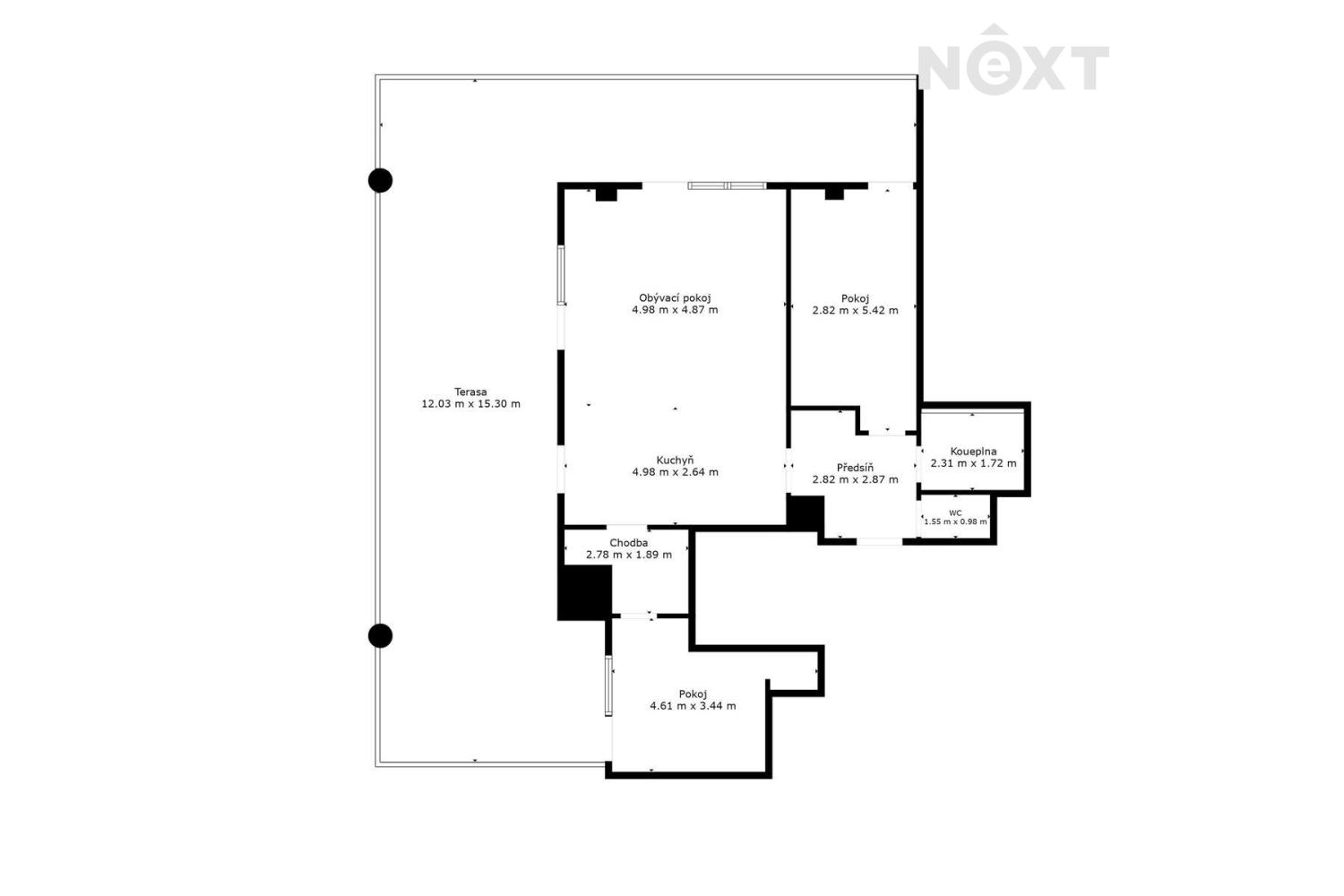 Terasa 73 m² přes celý byt – ideální pro relax, posezení i zeleň
