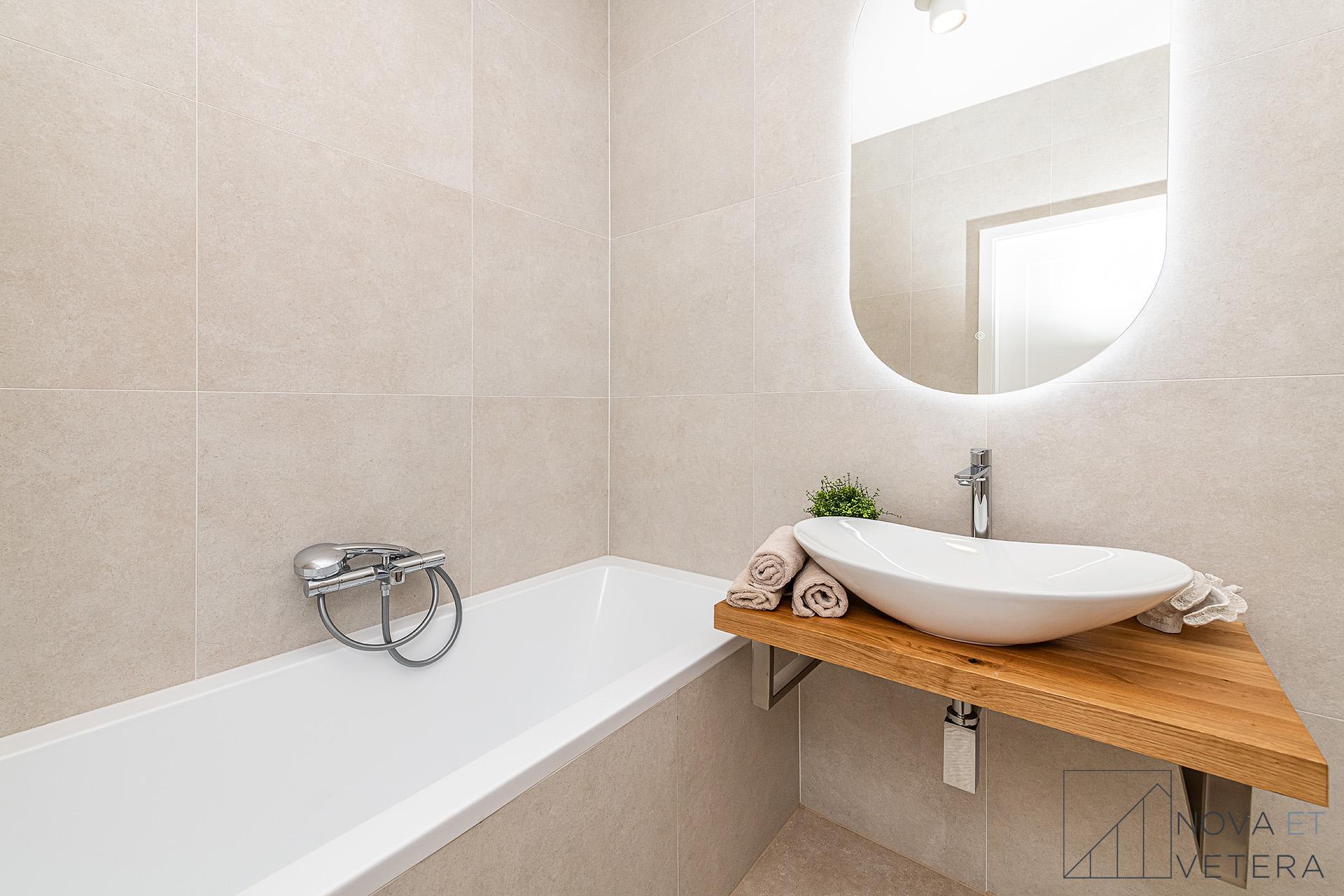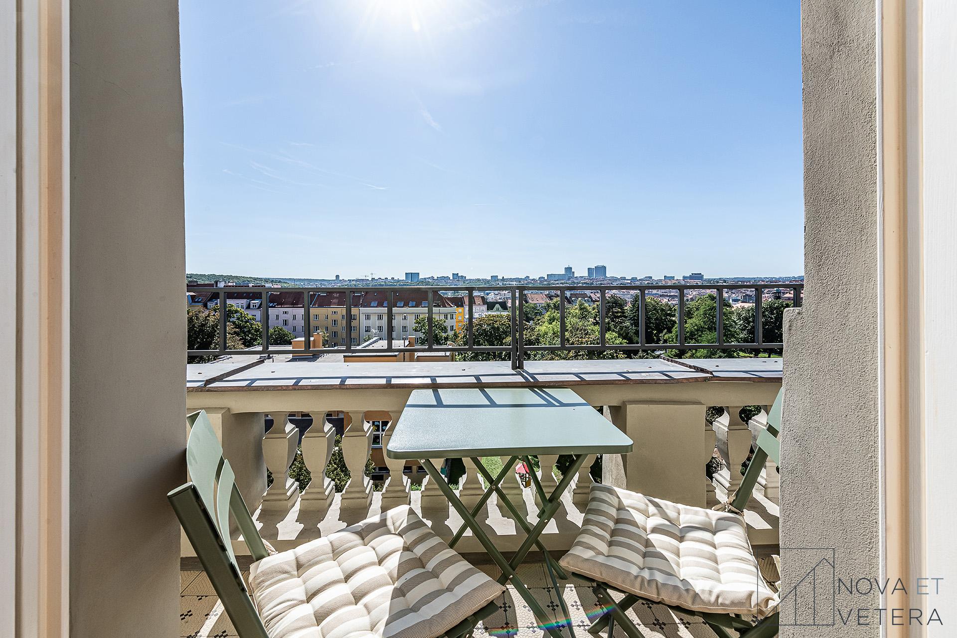 Byt je orientován na jih a západ, což zajišťuje dostatek denního světla a příjemnou atmosféru po celý den. Dominantním prostorem celého bytu je prostorný obývací pokoj se vstupem na terasu a kuchyňským koutem na míru, osazeným kvalitními spotřebiči MIELE, s pracovní deskou z přírodního kamene a důmyslným úložným systémem. Dvě samostatné ložnice jsou vybaveny designovým vestavěným nábytkem na míru, který maximálně využívá prostor. Hlavní ložnice s výhledem na panorama města nabízí místo pro odpočinek, které podtrhuje charakter celé nemovitosti. Koupelna je navržena v moderním, nadčasovém stylu a nabízí jak komfortní vanu, tak sprchový kout. K dispozici je také samostatná toaleta. Součástí bytu je sklep o ploše 2,23 m², který poskytuje praktické úložné zázemí.