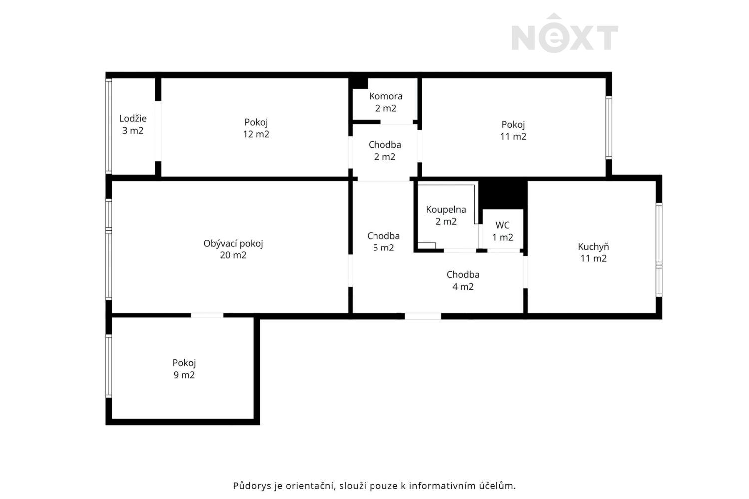 Dispozice je maximálně praktická – tři samostatné ložnice, velký obývací pokoj a světlý obytný prostor vhodný i pro větší rodinu. Samotná užitná plocha bytu činí 82,01 m², k bytu dále náleží lodžie o velikosti 2,44 m2 a dva sklepy o velikosti 1,99 m2 a 2,93 m2. Velkou praktickou výhodou jsou dvě samostatné toalety, které zpříjemní každodenní fungování domácnosti. Stejně praktické jsou i dva sklepy poskytující dostatek prostoru pro kola, kočárek, sportovní vybavení i sezónní věci. Byt působí velmi světlým a vzdušným dojmem.