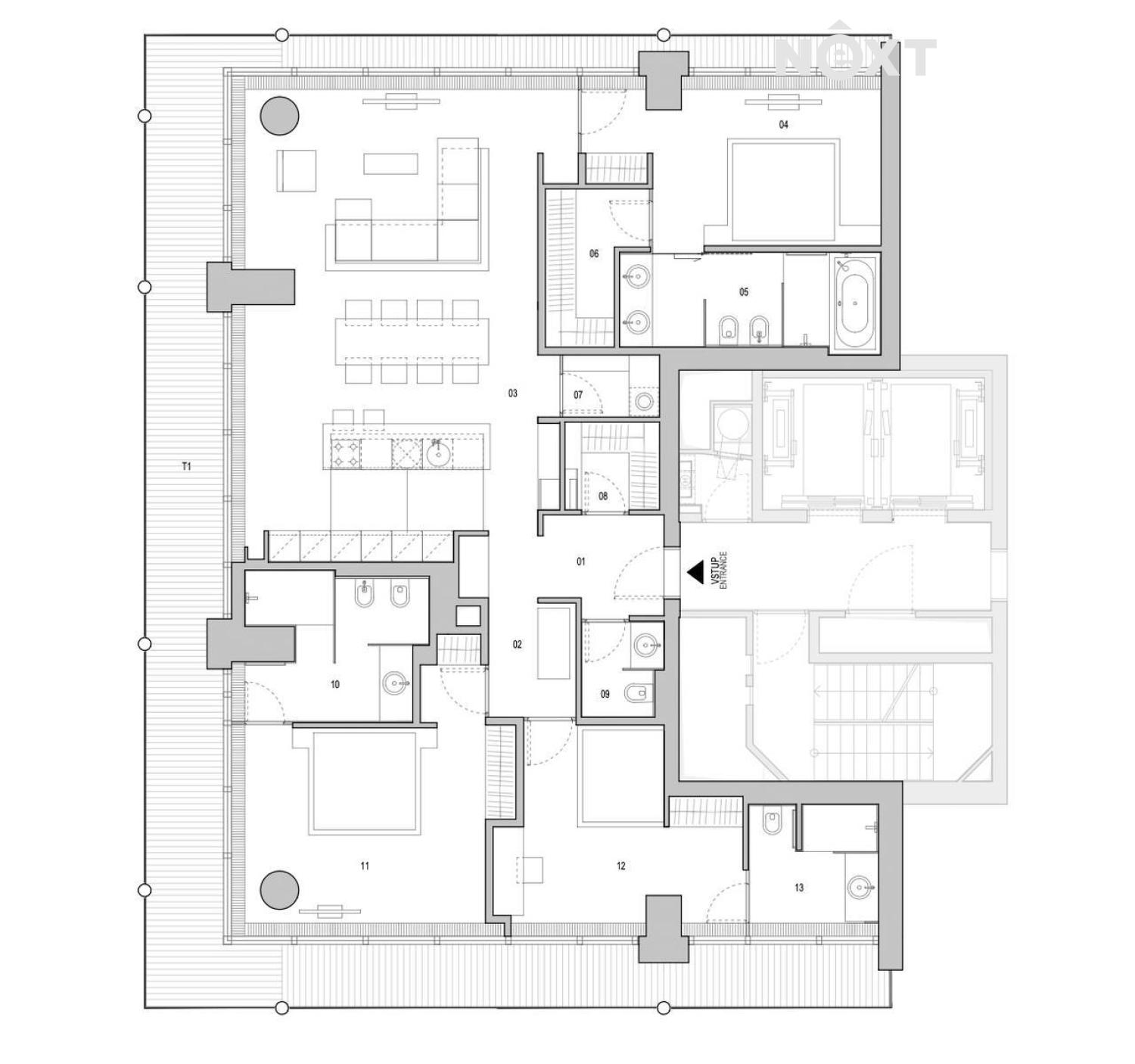 Byt se třemi ložnicemi, prostorným obývacím pokojem a terasou (51,1 m2) nabízí výhledy do tří světových stran - na celé město i okolí, zejména pak na Pražský Hrad, Vyšehrad, Vltavu a celé historické centrum města. Další předností tohoto bytu jsou koupelny u každé ložnice, komfortní šatny a úložné prostory.
