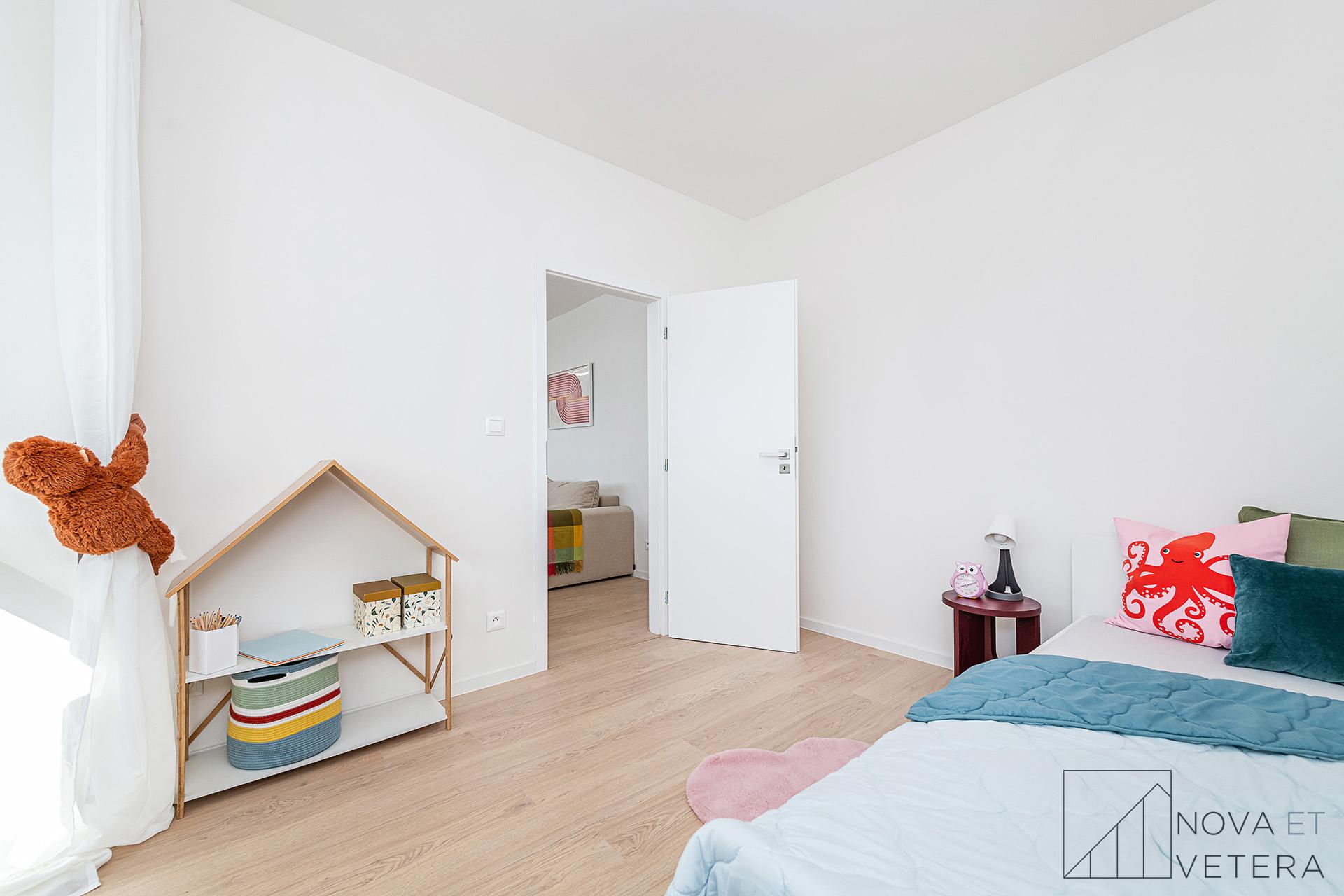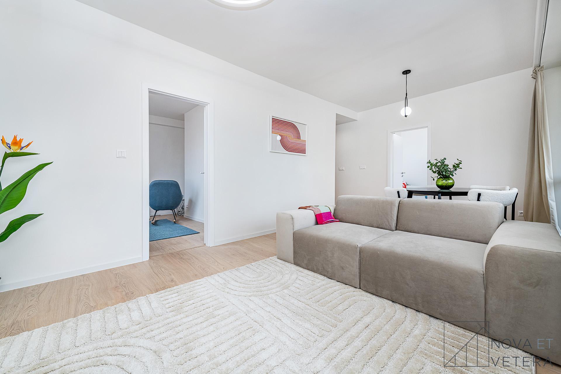 Jednotka je orientována na dvě světové strany - západ a sever. Světlý obývací pokoj disponuje vstupem na lodžii o velikosti 6 m² a s odděleným kuchyňským koutem. K dispozici jsou tři samostatné pokoje, které mohou sloužit jako ložnice, dětský pokoj, pracovna nebo pokoj pro hosty. Dva z pokojů mají vlastní vstup na lodžii, jedna o velikosti 3 m² a druhá 4,5 m². Moderní koupelna je vybavena sprchovým koutem a toaletou, druhá toaleta je samostatná. Vstupní chodba a samostatná místnost, která může sloužit jako komora nebo šatna nabízí dostatek úložného prostoru. K bytu náleží sklepní kóje o velikosti 2 m².