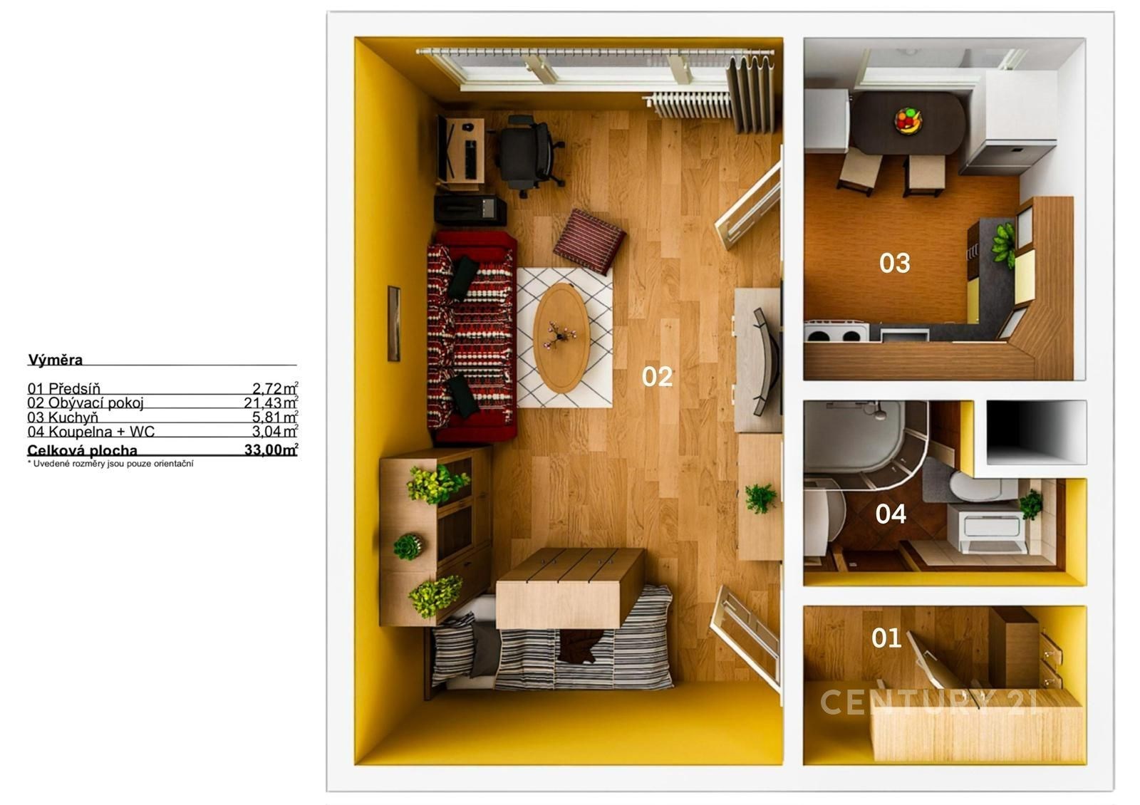 - Celková podlahová plocha: 33 m²
