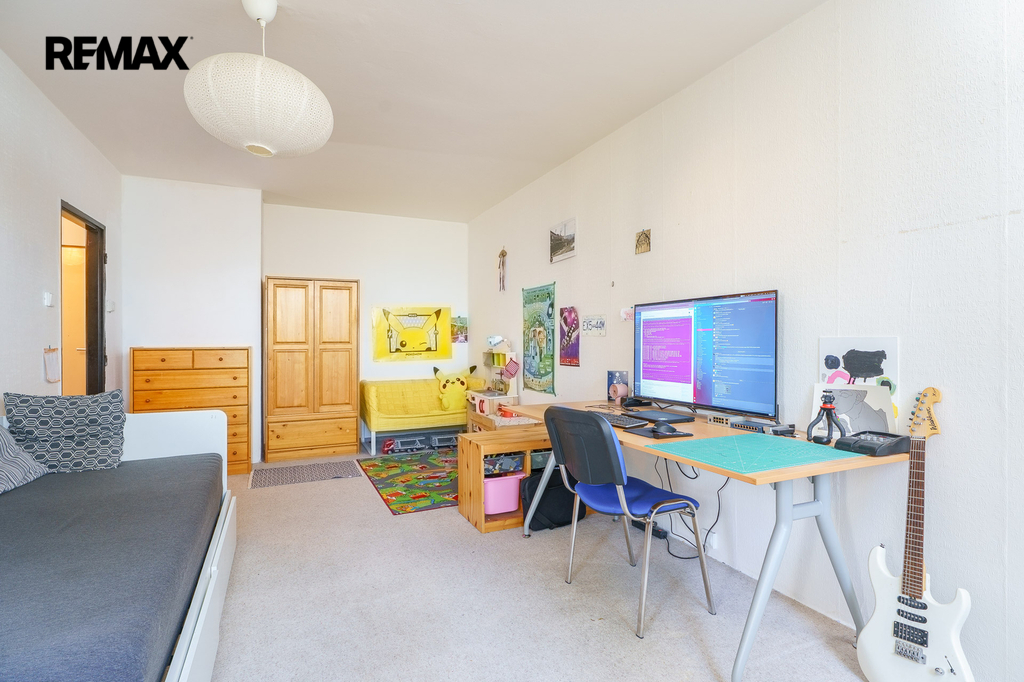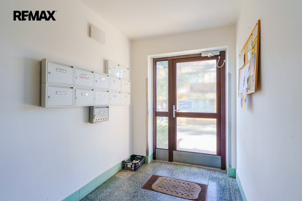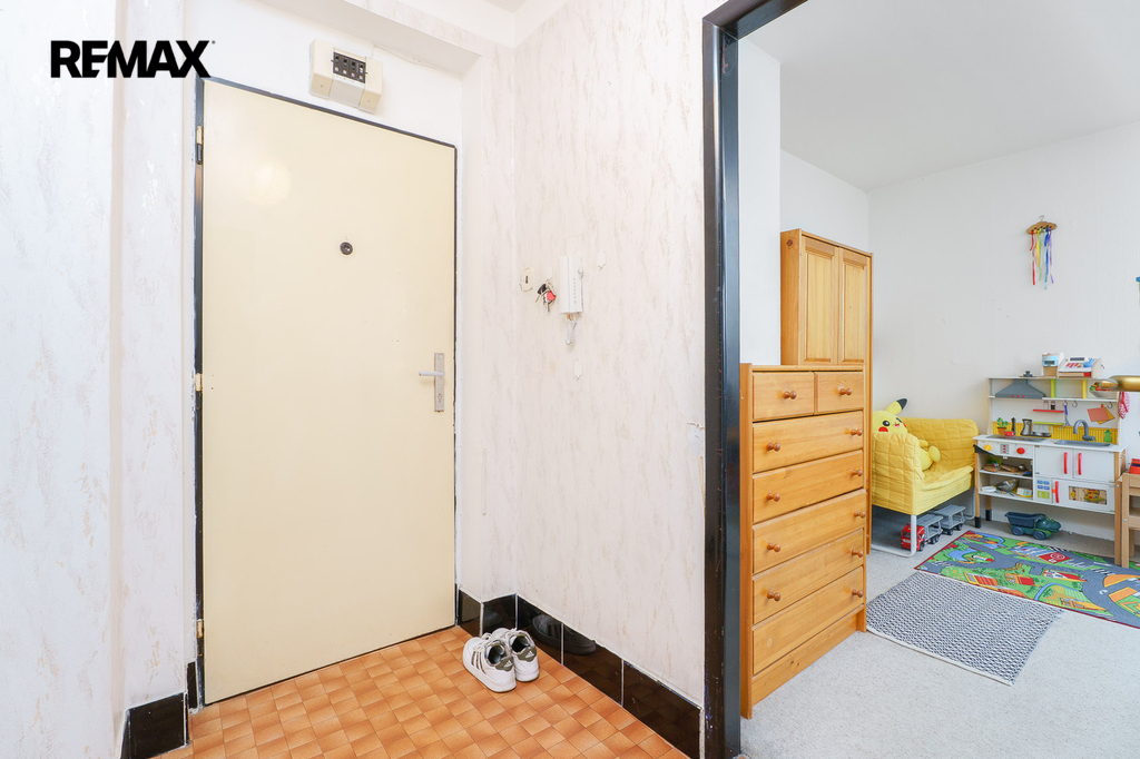 Západně orientovaný byt nabízí vstupní chodbu s komorou, která je zároveň i technickou místností s plynovým kotlem. Vlastní plynový kotel vytápí byt a zjišťuje teplou vodu nezávisle na zdrojích dálkového tepla, jak tomu bývá na velkých sídlištích. Dále WC a koupelna s vanou a umyvadlem. Velký obývací pokoj umožňuje prostorové řešení i pro spaní. Navazuje kuchyně s původní kuchyňskou linkou, vestavěnou spíží i místem pro jídelní stůl. K bytu náleží sklep.