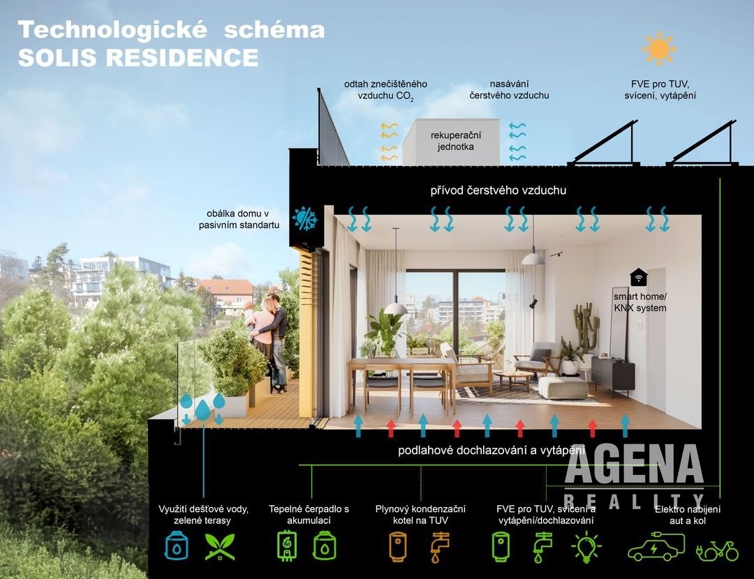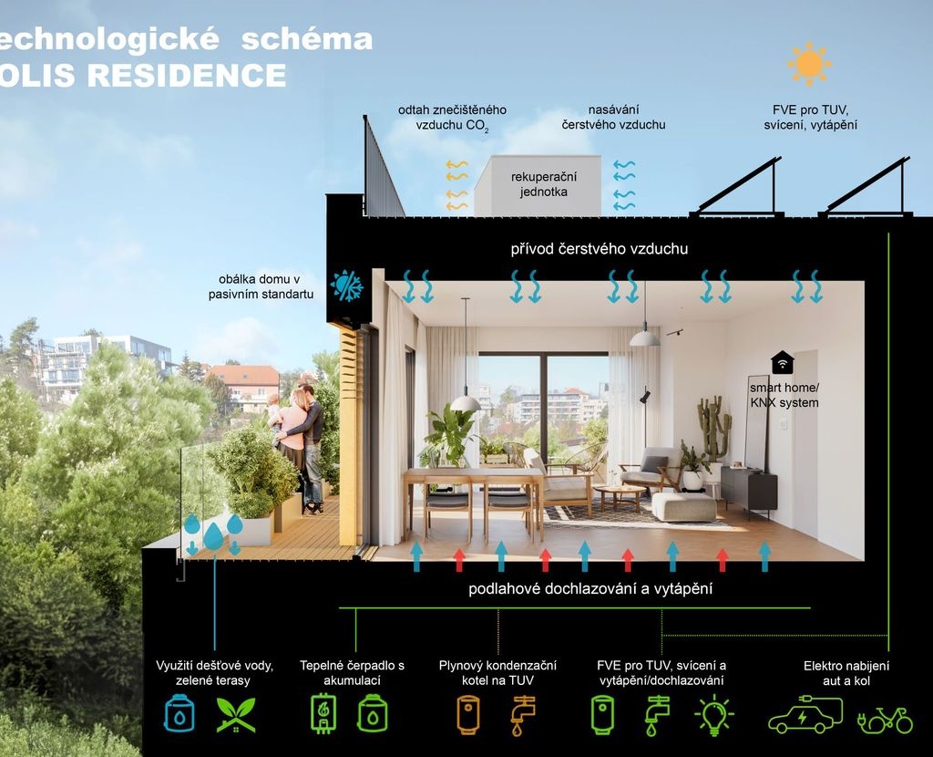 Rezidence je navržena s důrazem na udržitelnost a moderní technologie. Součástí řešení je systém vzduchotechniky s rekuperací, podlahové vytápění a dochlazování, chytré ovládání bytu a podpora z FVE na střeše. Projekt počítá také se zelenými střechami, komunitními zahradami, zpětným využitím dešťové vody a dalšími ekologickými opatřeními.