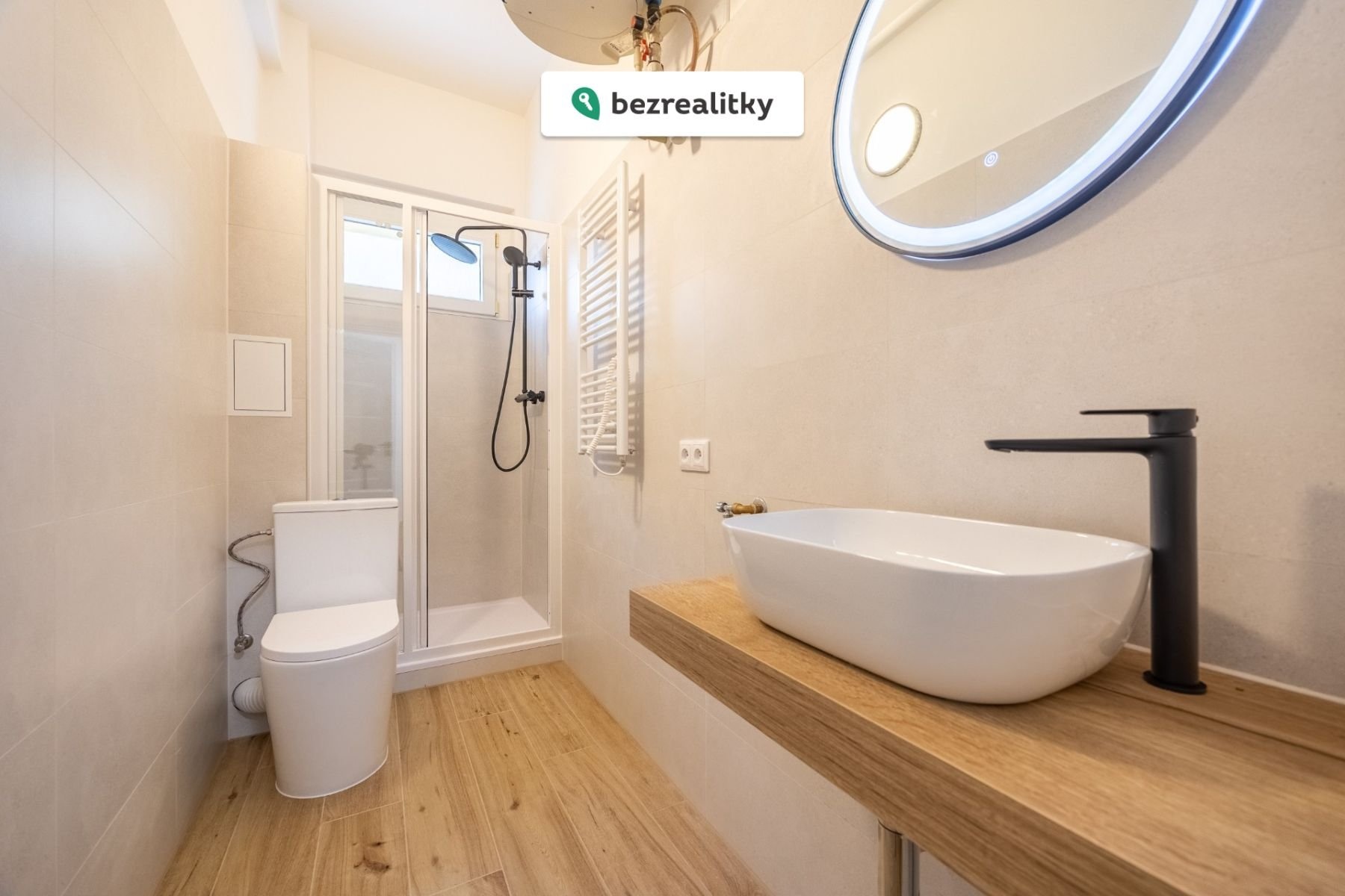 Koupelna je navržena v přírodních tónech, s velkoformátovými obklady a dřevěnou dlažbou, a je vybavena sprchovým koutem a toaletou.