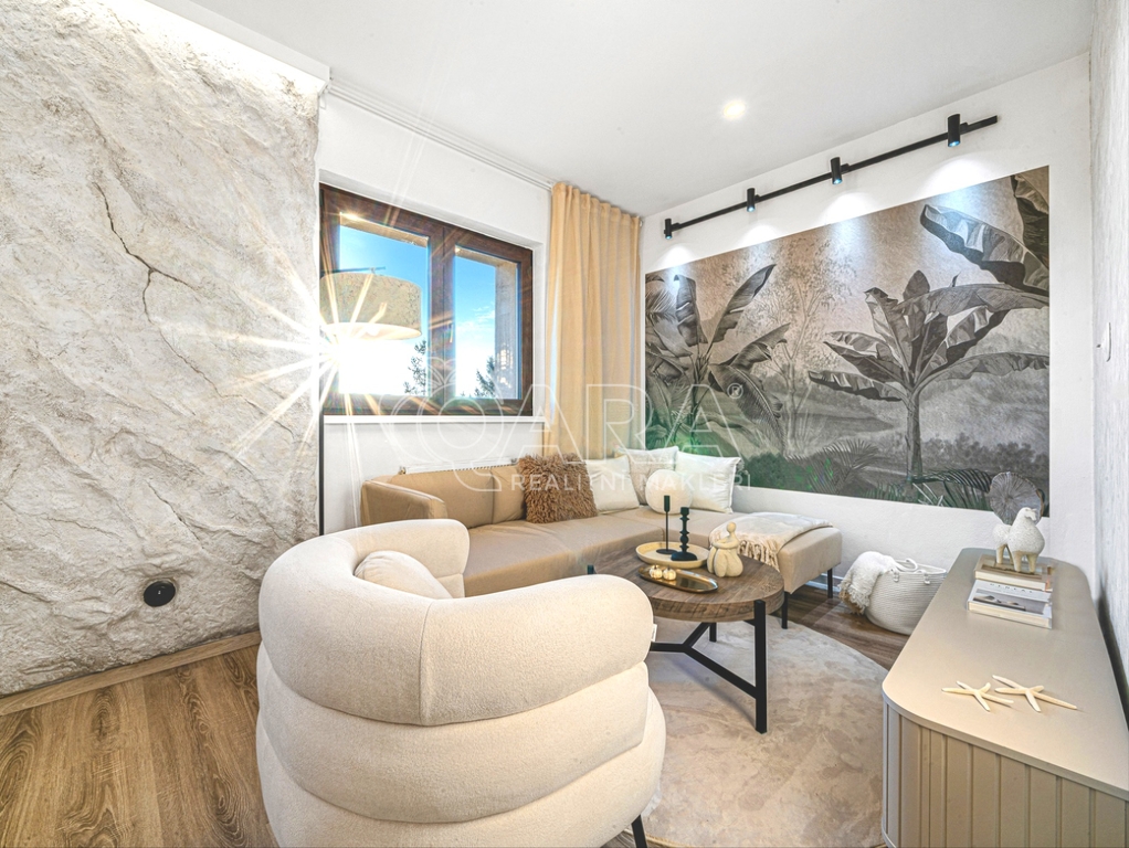 Dominantou obývací části je originální umělecký prvek, a to dekorativní plastika skály, která dodává bytu osobitý charakter a světový styl.