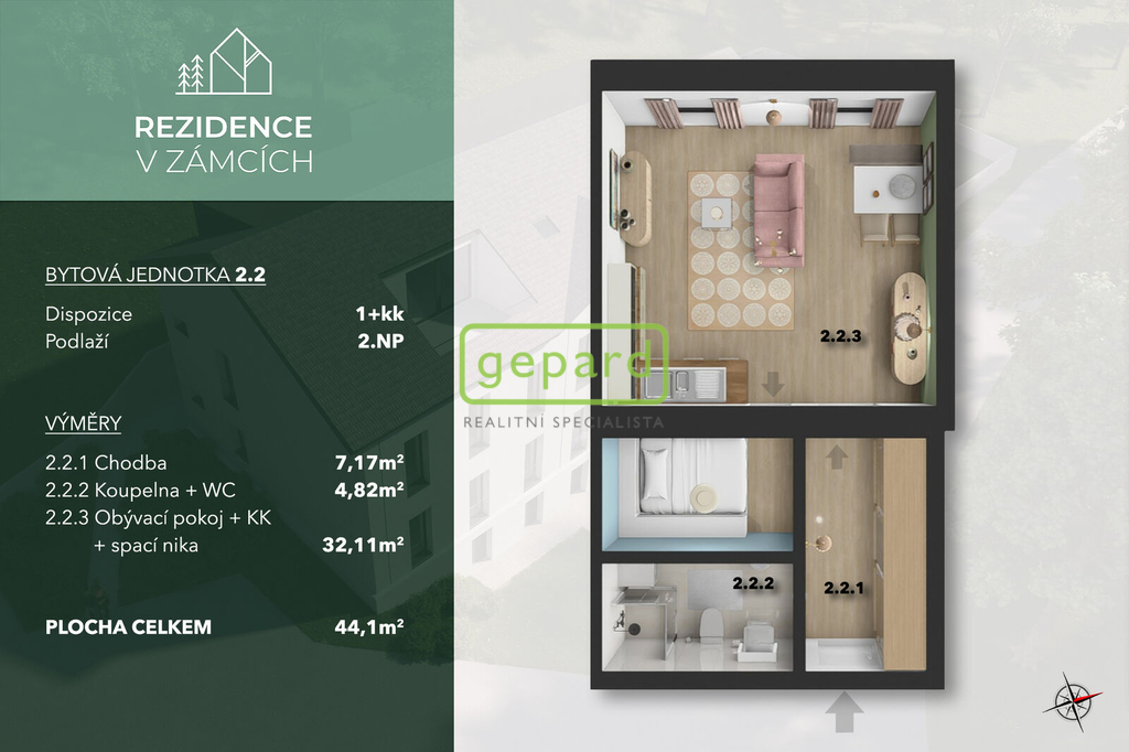 - Celková podlahová plocha: 44 m²