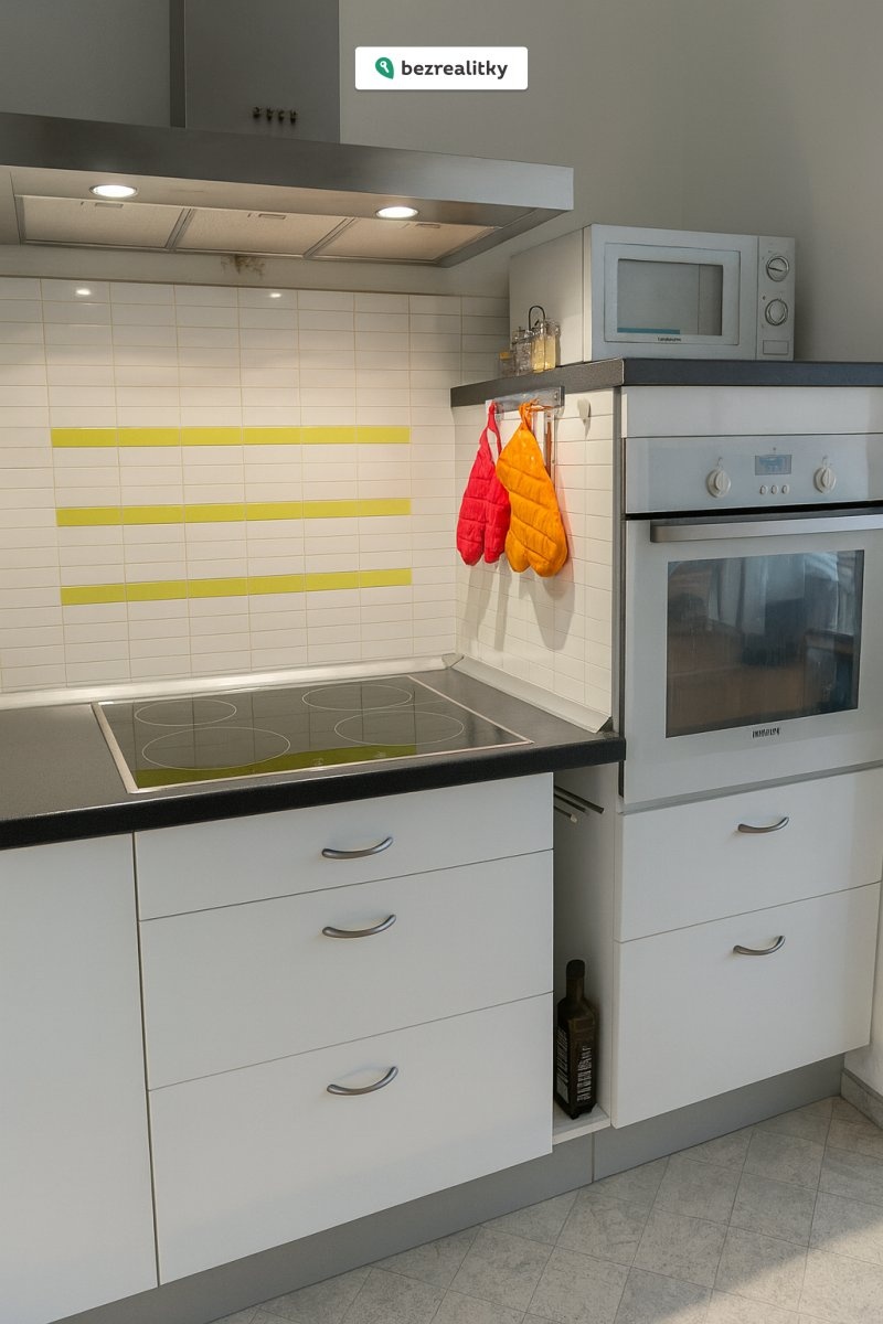 Součástí bytu je kuchyňská linka se spotřebiči (lednice, mikrovlnná trouba, horkovzdušná trouba, elektrický sporák, digestoř). V obytné části je dřevěná podlaha, v kuchyni a na chodbě lino. Koupelna je vybavena vanou a WC.