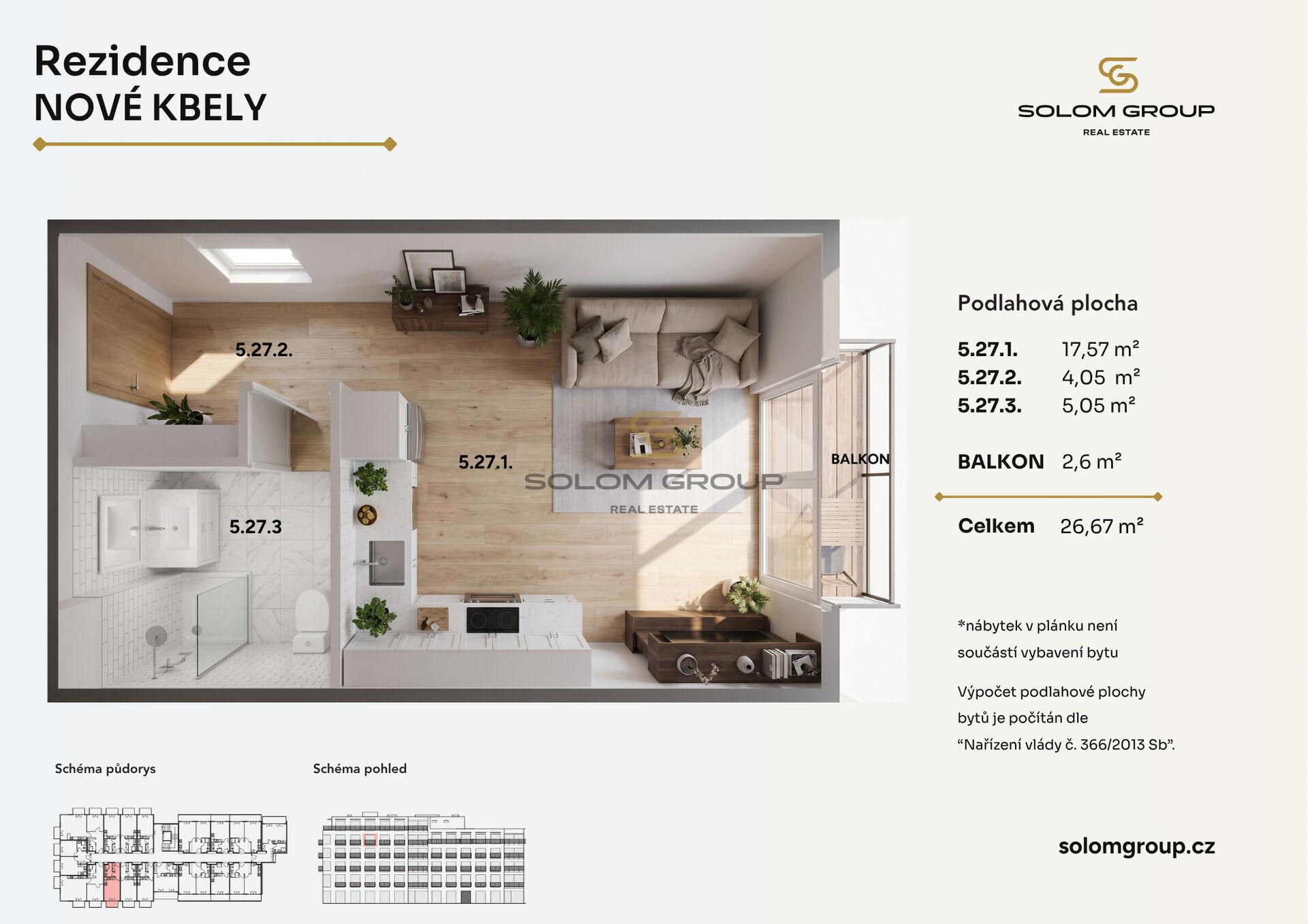Prodej nového bytu 1+kk, 27,4 m² + balkon 2,6 m², který se nachází v 5. NP cihlové novostavby v rezidenci Nové Kbely, Praha – Kbely.