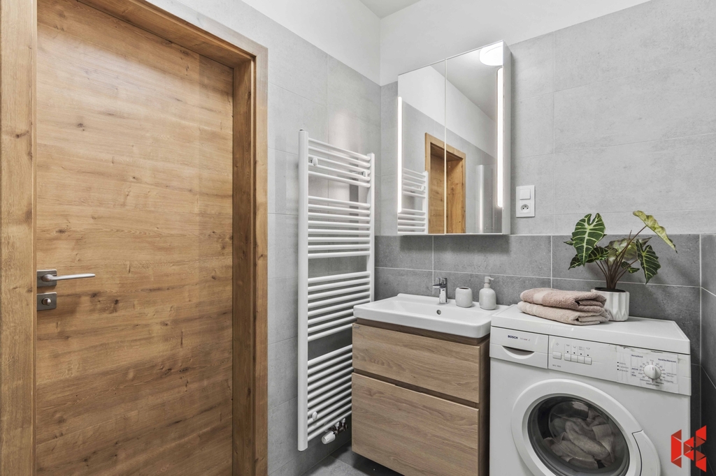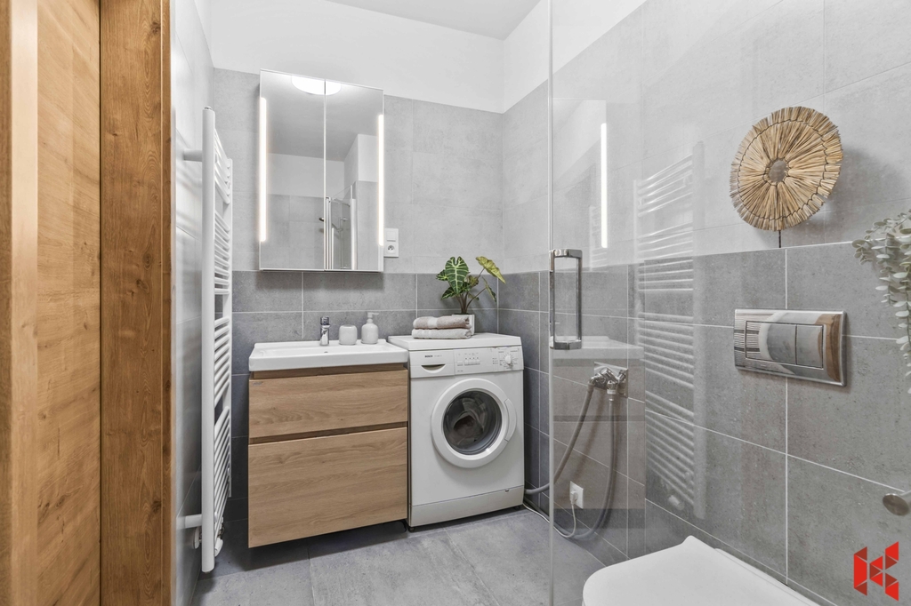 ✔ Prostornou koupenou se sprchovým koutem, místem pro pračku a WC
