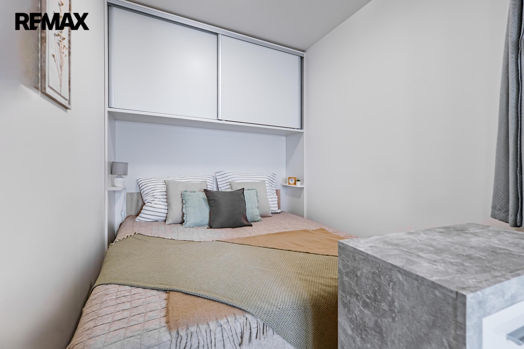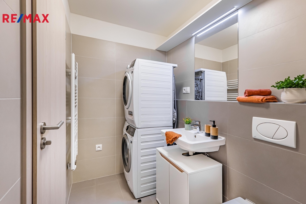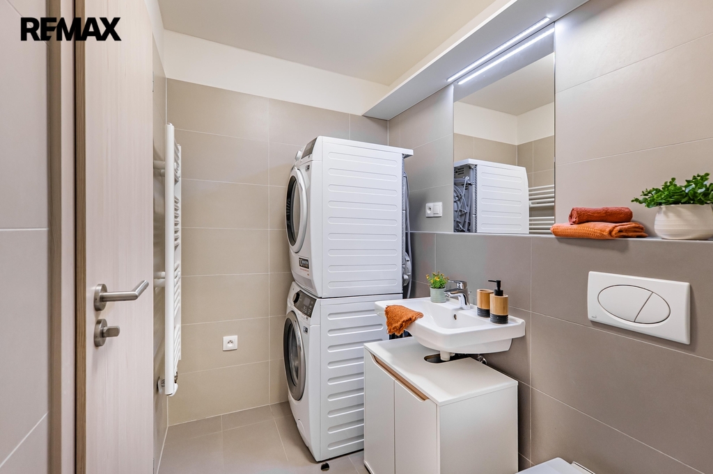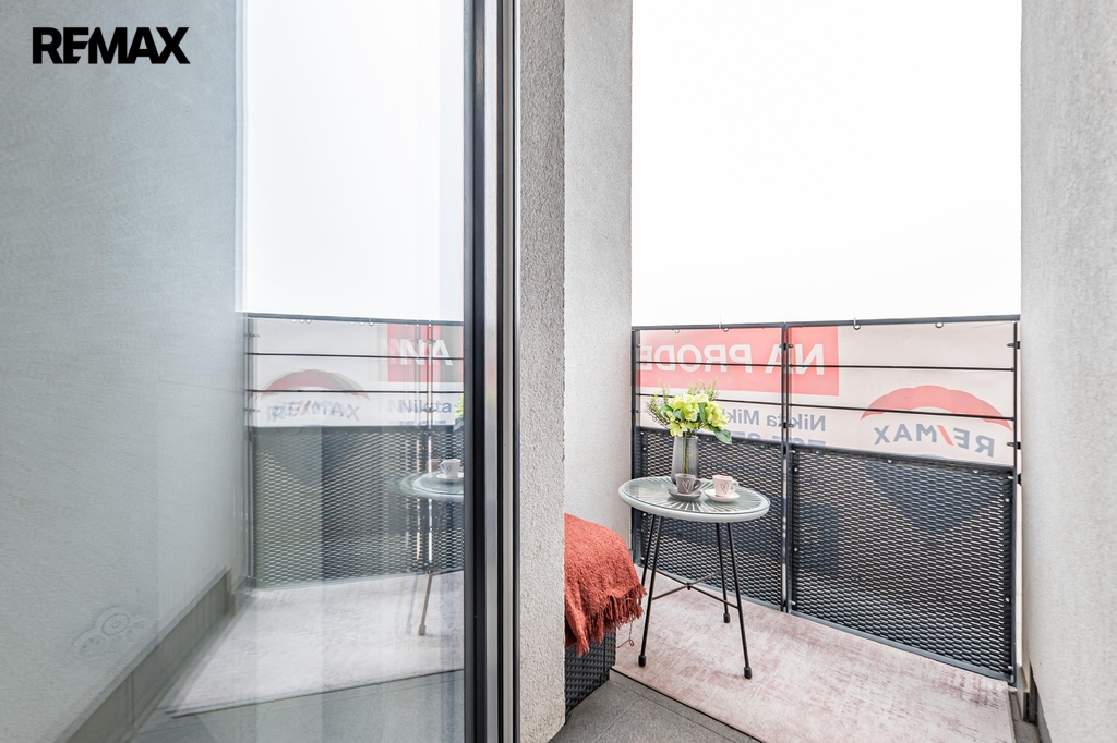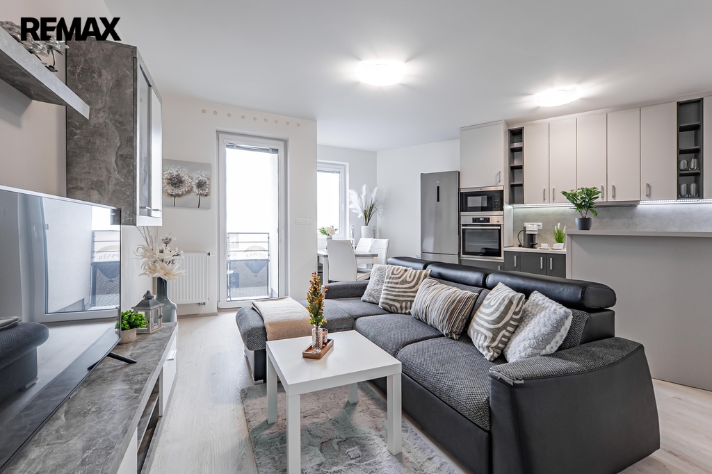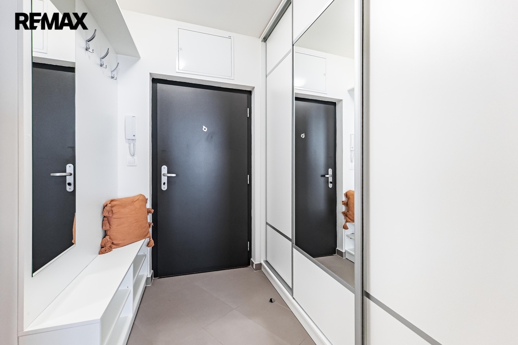 Interiér je připraven k okamžitému nastěhování bez dalších investic. V obývací části je pohodlný gauč, televizor (2 ks) a jídelní stůl. Ložnicová zóna nabízí manželskou postel a praktické úložné prvky. Kuchyňská linka s kvalitními spotřebiči AEG (trouba, varná deska, digestoř, myčka, lednice) je doplněna o kávovar, topinkovač a mixér značky MICAN. Koupelna je vybavena sprchovým koutem a pračkou se sušičkou. V předsíni potěší velká vestavěná skříň a botník, v bytě je dále menší komora a příjemná lodžie pro ranní kávu či večerní posezení.