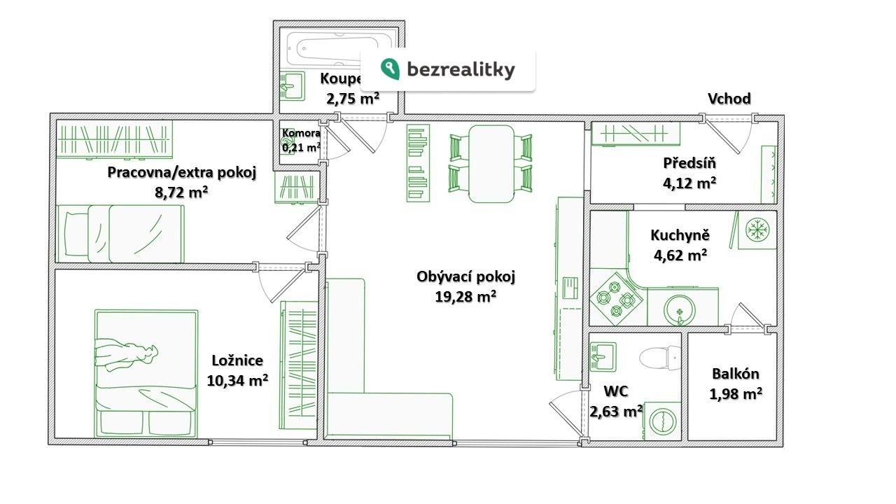 Byt má praktickou a variabilní dispozici 2+1 – najdete zde prostorný obývací pokoj, kuchyň a ložnici, která byla rozdělena lehkou příčkou. Tím vznikl další pokoj, vhodný například jako dětský pokoj, pracovna nebo šatna. Příčku lze však kdykoliv odstranit. Součástí bytu je také koupelna, samostatná toaleta a komora.