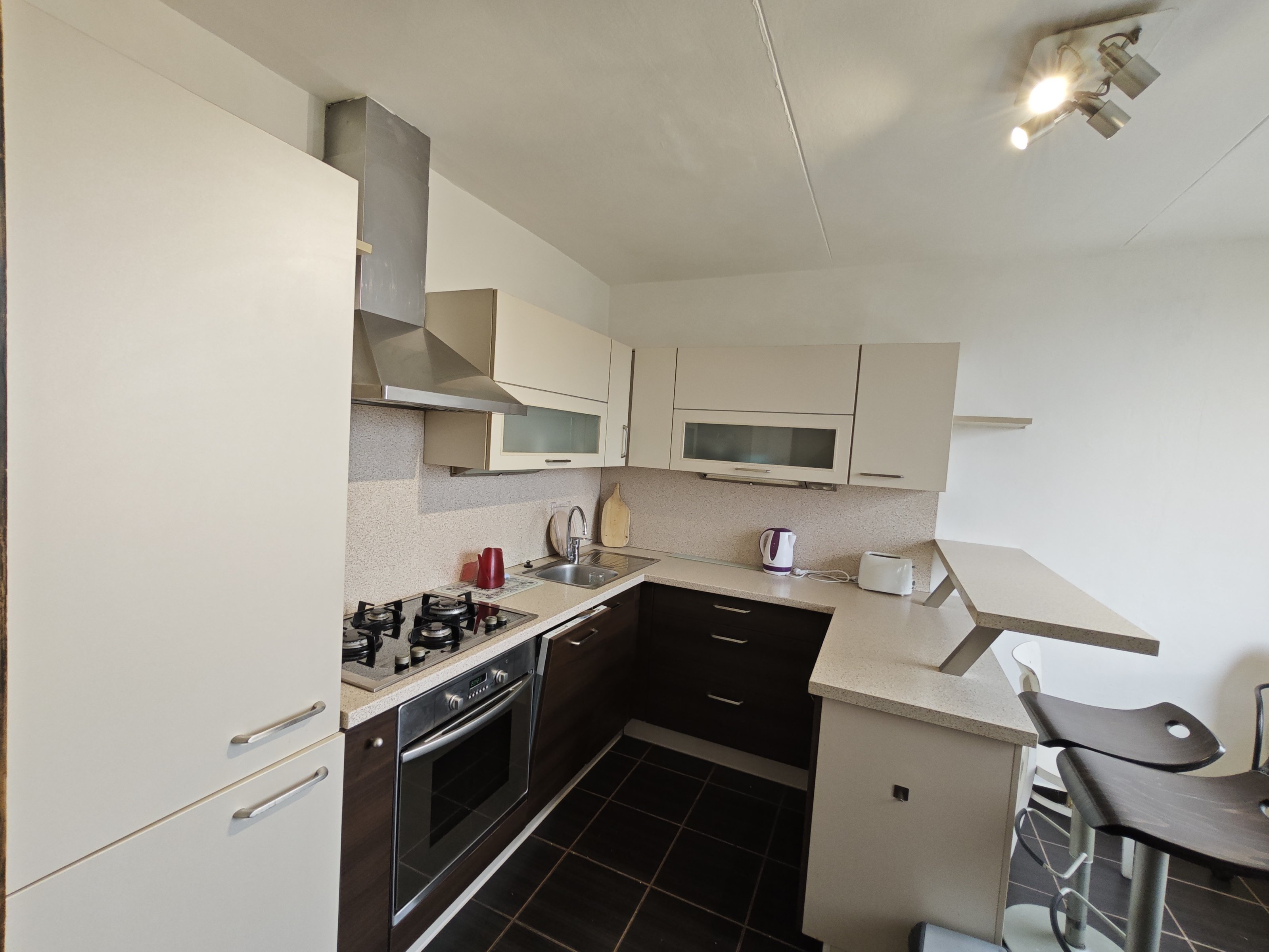 V bytě je zrenovovaná elektřina v kuchyni a koupelně, starší zděné jádro a zasklená lodžie( 2,6m2) s hezkým výhledem na Prahu. Kuchyňská linka s barovým pultem, vestavnou lednicí, myčkou, varnou plynovou deskou a elektrickou troubou. Součástí bytu je sklepní kóje v suterénu domu (2 m²).