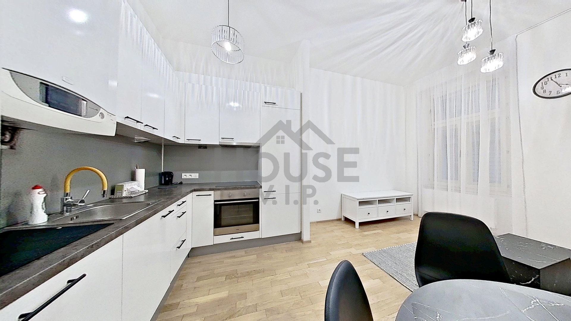 Dispozice a vybavení: předsíň, obývací pokoj s kuchyňským koutem na míru (lednice s mrazákem, trouba, varná deska),