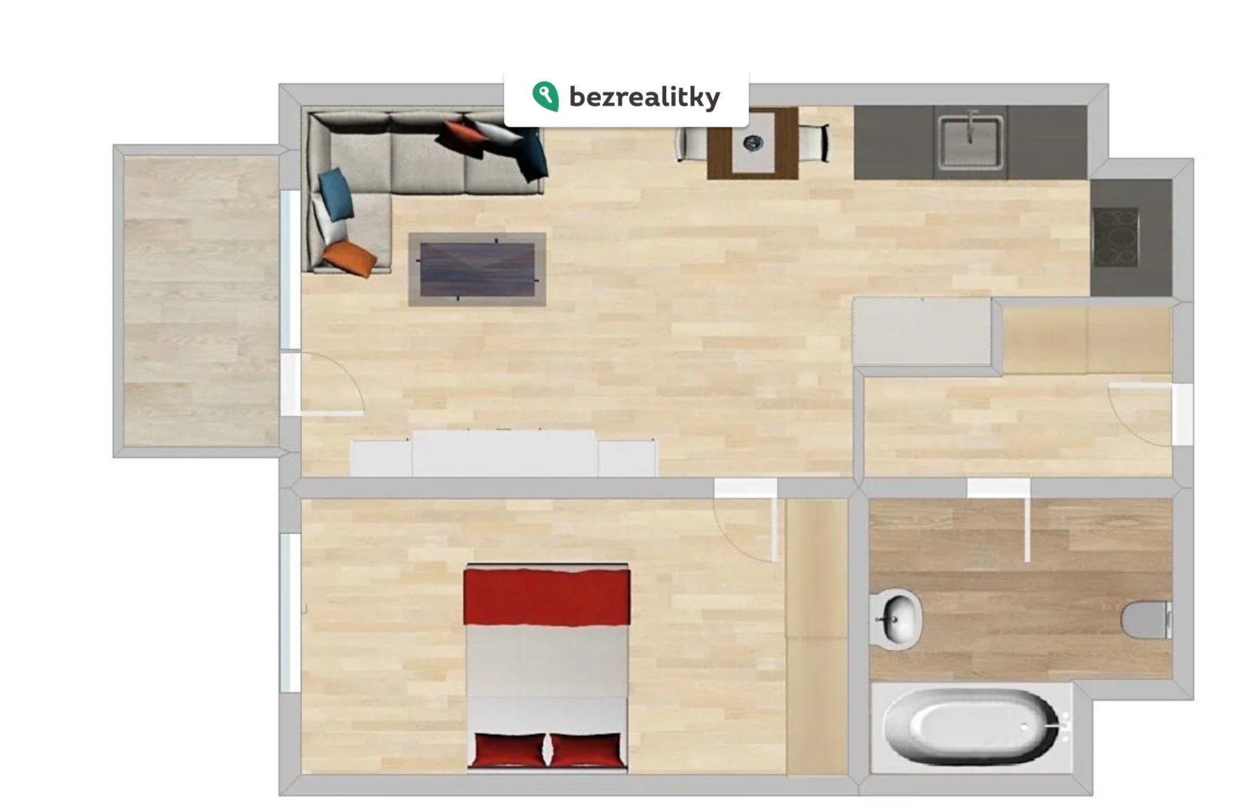 Byt disponuje funkční dispozicí, která kombinuje prostorný obývací kout s kuchyňským koutem a samostatným pokojem. Součástí nemovitosti je také balkón o ploše 5 m², kde si můžete užívat čerstvého vzduchu, a sklep o ploše 3 m², který nabízí dostatek místa pro uložení sezónního vybavení.