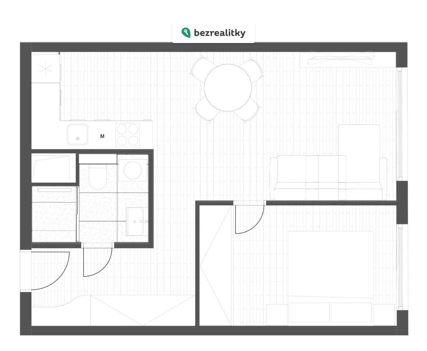 Dispozice bytu nabízí prostorný obývací pokoj s kuchyňským koutem, neprůchozí ložnici s místem pro velkou skříň, koupelnu se sprchovým koutem i záchodem a vstupní chodbu připravenou na velkou vestavnou skříň. K bytu náleží sklepní kóje o velikosti 3.6 m². Byt je orientován na západ, což zajišťuje příjemné světelné podmínky zejména v odpoledních hodinách.