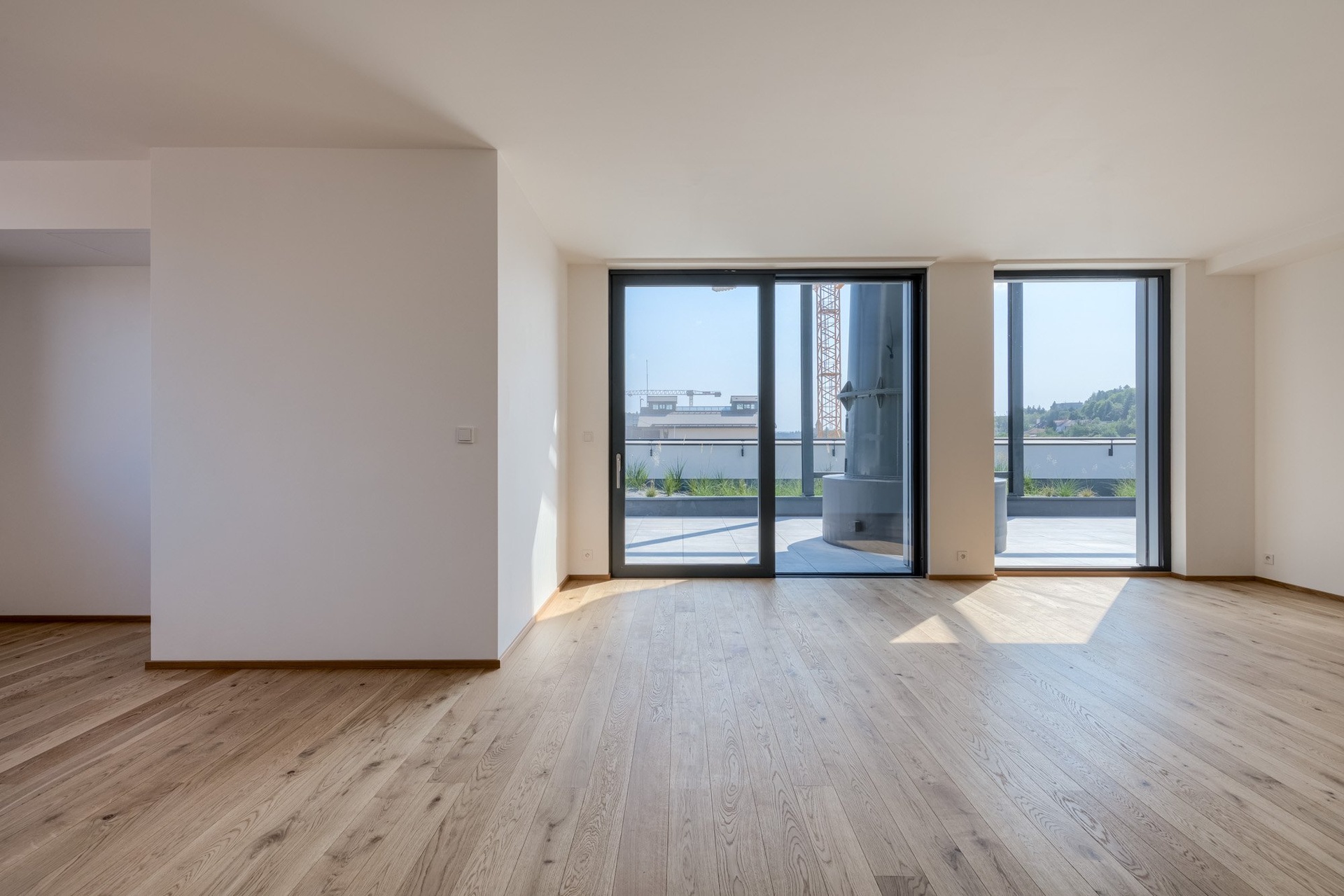 O pohodlí se starají moderní technologie – rekuperace, stropní chlazení, exteriérové žaluzie či izolační trojskla. Vše je řízeno chytrým systémem Loxone, který zajišťuje příjemné a úsporné bydlení v každém ročním období.